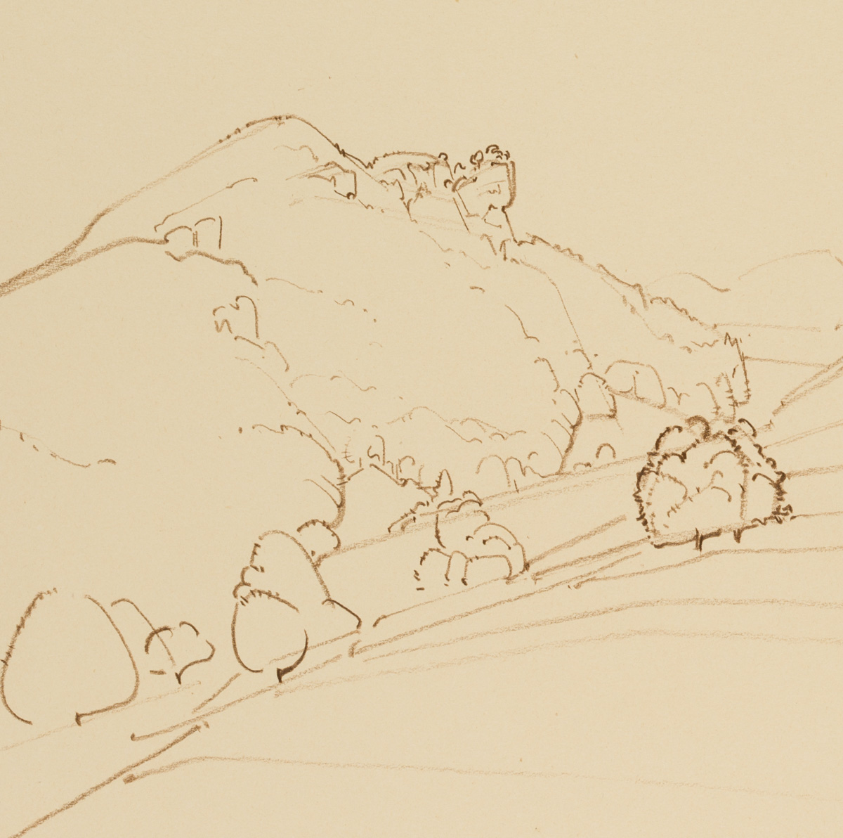 - Zustand: Guter Zustand. Vereinzelt blasse Verfärbungen im Bereich der Ecken und Ränder. Das Blatt ist durch eine frühere Hängung mit Hilfe von Nadeln im Bereich der Ecken beschädigt. Die Darstellung wird hiervon nicht beeinträchtigt. Rückseitig eine weitere skizzenhafte Formulierung der selben Landschaft.