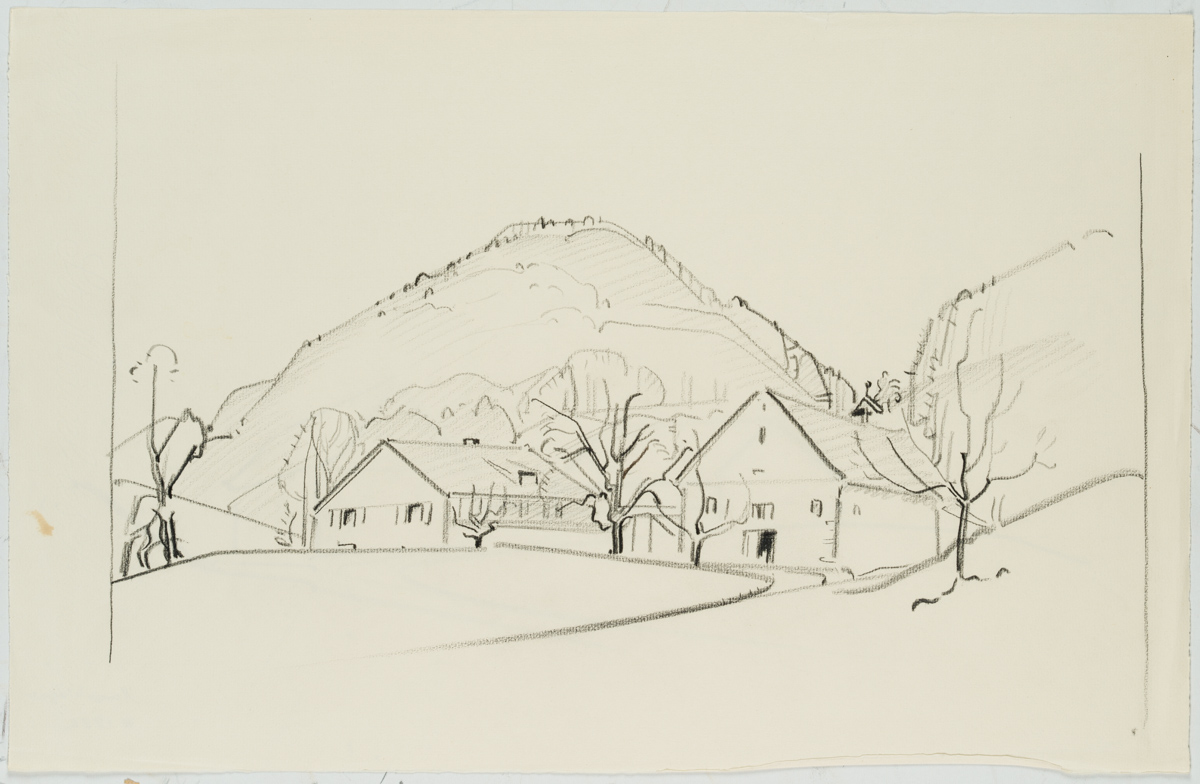 - Description: Without designation. View of a hilly landscape. In the middle ground two houses can be seen, possibly a farmstead. It is surrounded by trees, in the background an elevation can be seen. Born in Affeltrangen, Austria, in 1885, Hans WAGNER attended the school of arts and crafts in Munich. In the autumn of 1913 he acquired a patent as a drawing teacher for Switzerland. Numerous sketches, drawings and prints have been preserved, which Wagner produced in a wide variety of media – such as charcoal, watercolour or as woodcuts.