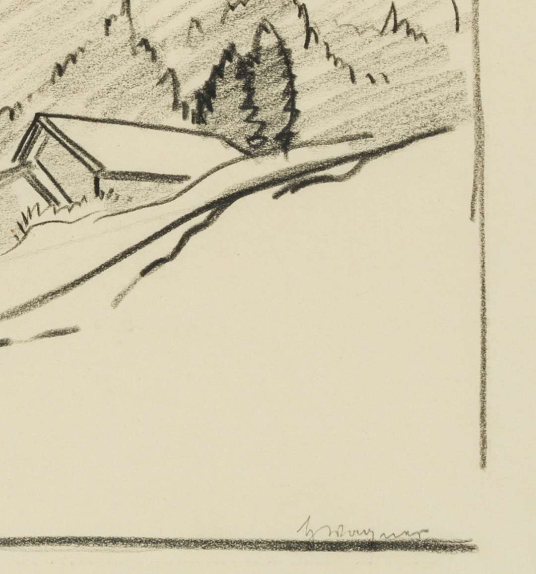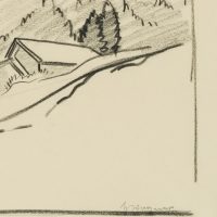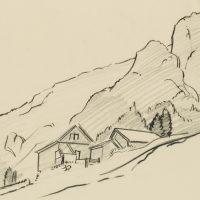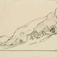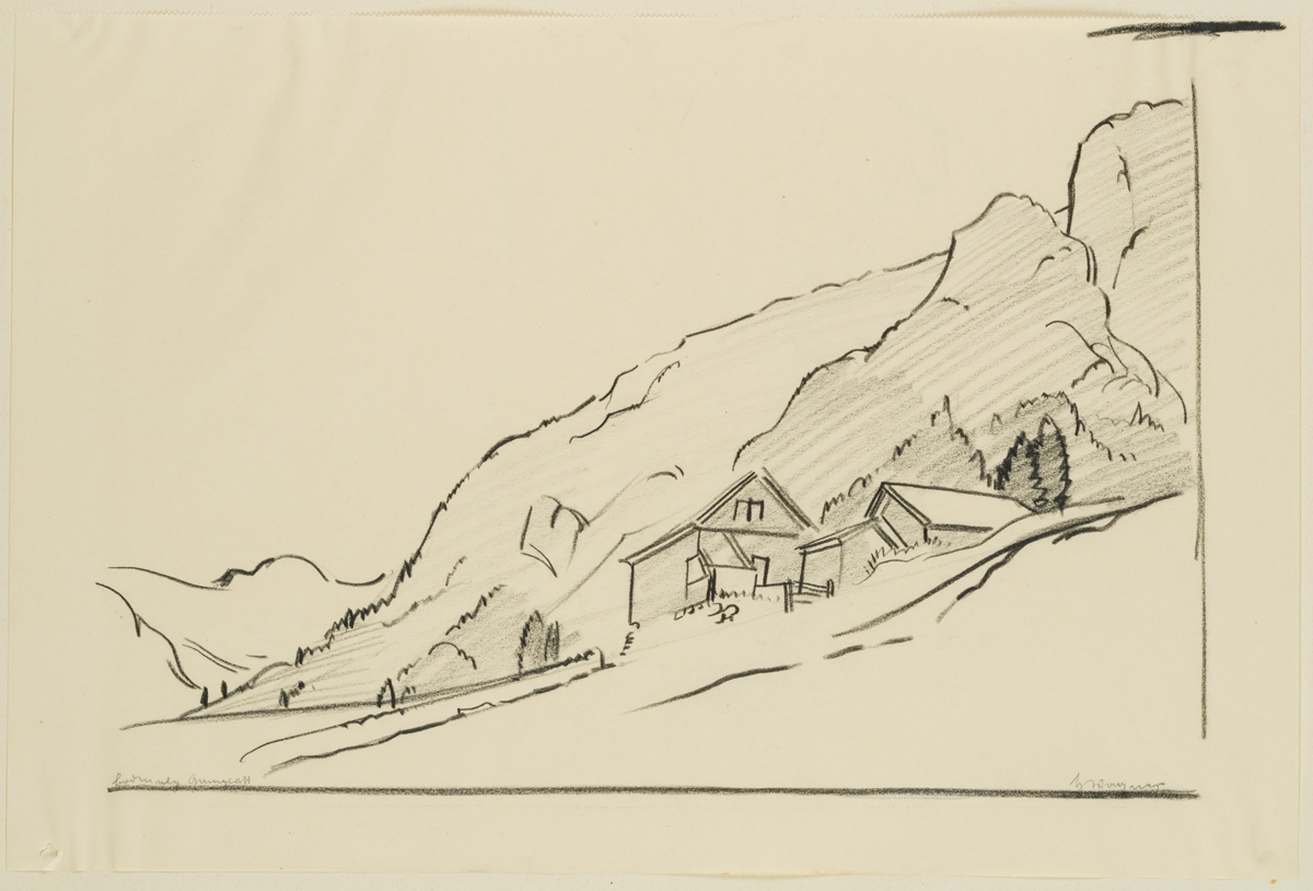 - Description: Inscribed lower right “Wagner”, named (illegible). At the foot of a mountain slope, a farmstead or courtyard can be seen on the right, lined with trees. Behind it the steep slopes of a mountain can be seen. Born in Affeltrangen, Austria, in 1885, Hans WAGNER attended the School of Applied Arts in Munich. In the autumn of 1913 he acquired a patent as a drawing teacher for Switzerland. Numerous sketches, drawings and prints have been preserved, which Wagner produced in a wide variety of media – such as charcoal, watercolour or as woodcuts.