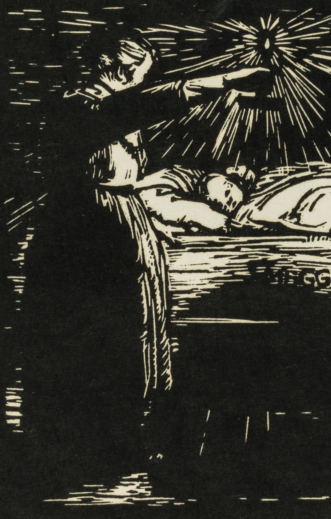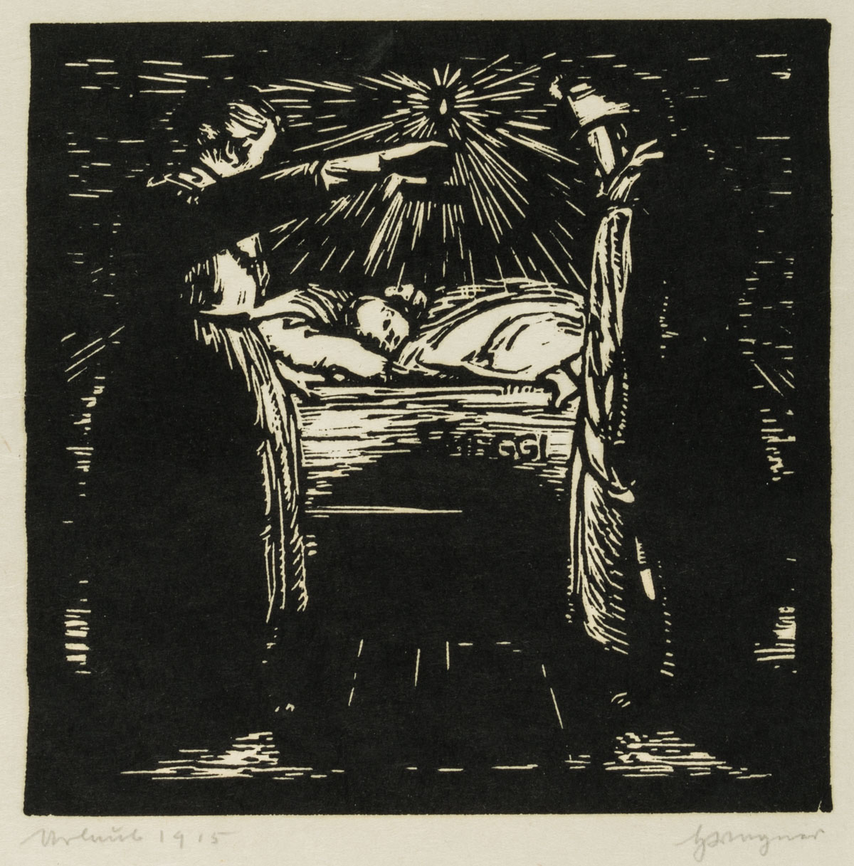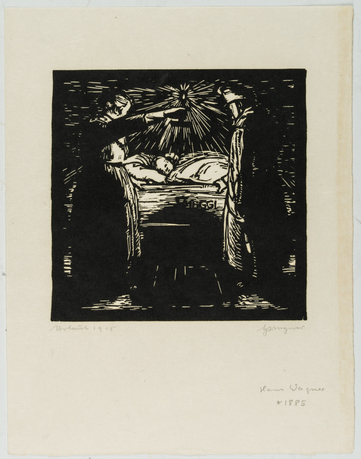 - Description: Inscribed “Wagner”, named “Urhütte 1915”. In the dark pictorial space of the depiction, a female and a male figure on the back can be seen in the foreground. They both turn towards an infant, who can be seen in the centre of the picture, wrapped in a cloth. Above him a light source illuminates the room. Born in Affeltrangen, Austria, in 1885, Hans WAGNER attended the School of Applied Arts in Munich. In the autumn of 1913 he acquired a patent as a drawing teacher for Switzerland. Numerous sketches, drawings and prints have been preserved, which Wagner produced in a wide variety of media – such as charcoal, watercolour or as woodcuts.