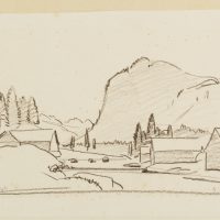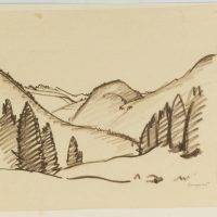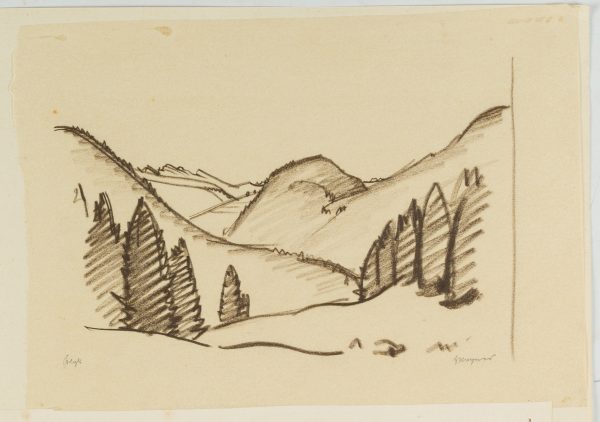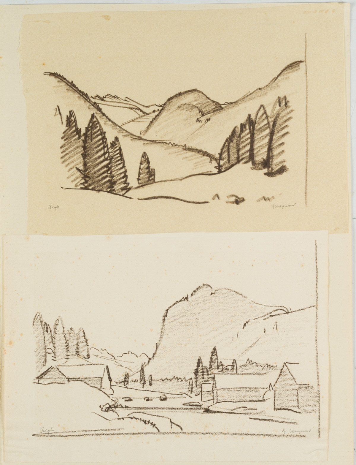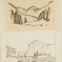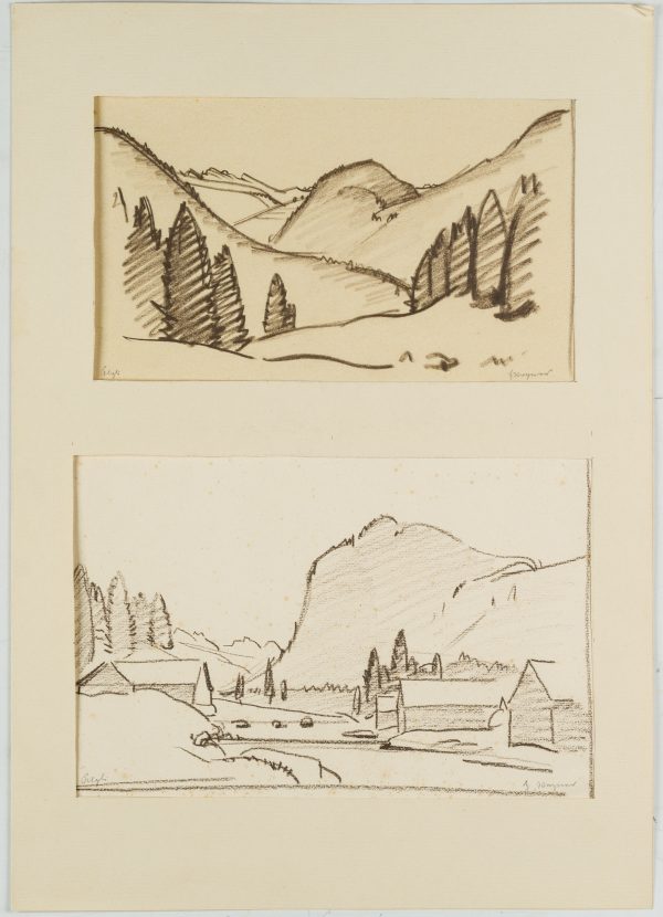 - Description: Inscribed in each case lower right “Wagner”, “H. Wagner”, named (illegible). In the upper depiction the viewers look into a hilly landscape, which is lined with conifers in the foreground. Below a view of a small village, behind which a massif rises. Born in Affeltrangen, Austria, in 1885, Hans WAGNER attended the School of Applied Arts in Munich. In the autumn of 1913 he obtained a patent as a drawing teacher for Switzerland. Numerous sketches, drawings and prints have been preserved, which Wagner produced in a wide variety of media – such as charcoal, watercolour or as woodcuts.