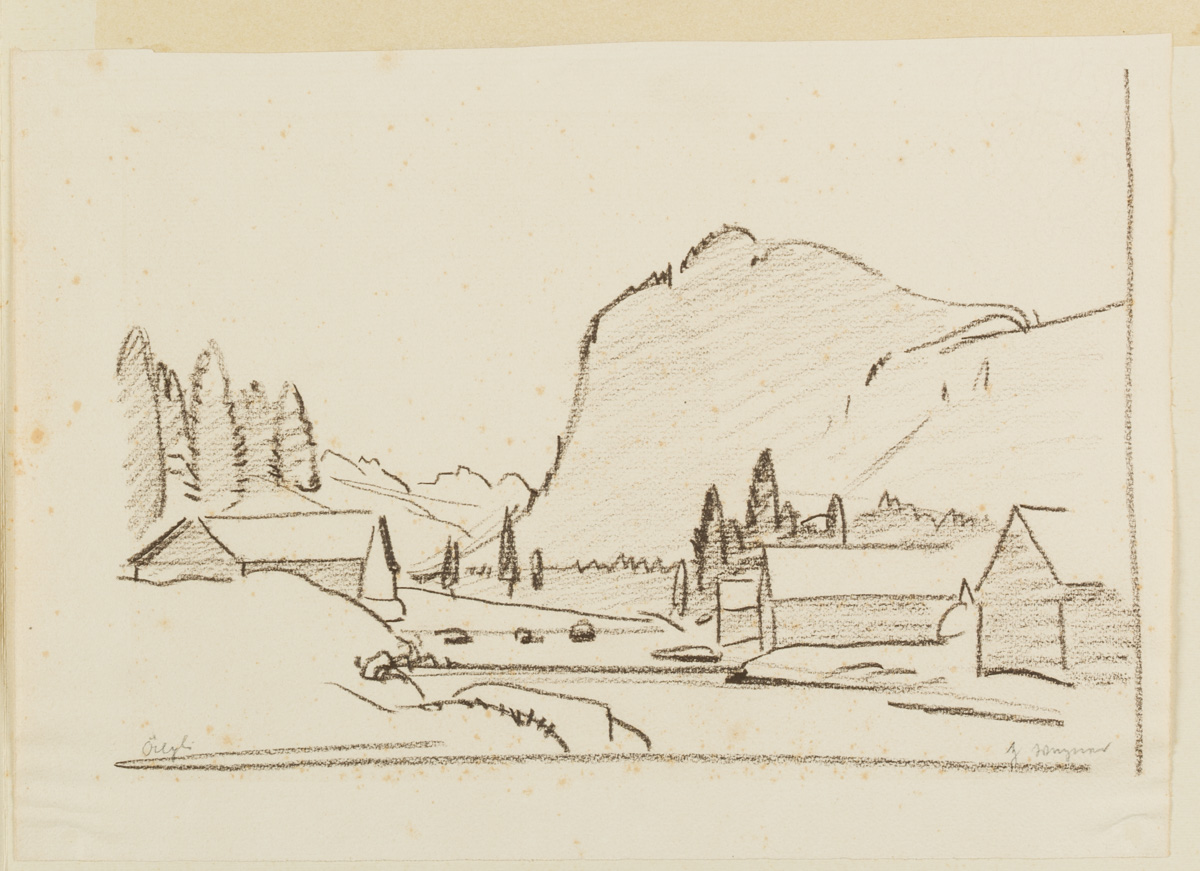 - Beschreibung: Bezeichnet jeweils unten rechts “Wagner”, “H. Wagner”, benannt (unleserlich). In der oberen Darstellung blicken die Betrachtenden in eine hügelige Landschaft, die im Vordergrund von Nadelbäumen gesäumt wird. Darunter ein Blick auf ein kleines Dorf, hinter welchem sich ein Massiv erhebt. 1885 in Affeltrangen, Österreich, geboren, besuchte Hans WAGNER die Kunstgewerbeschule in München. Im Herbst des Jahres 1913 erwarb er das Patent als Zeichenlehrer für die Schweiz. Zahlreiche Skizzen, Zeichnungen und Drucke sind erhalten, die Wagner in den unterschiedlichsten Medien – wie Kohle, Aquarell oder als Holzschnitt – anfertigte.