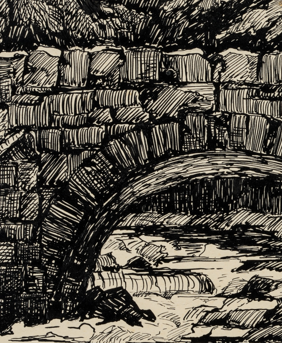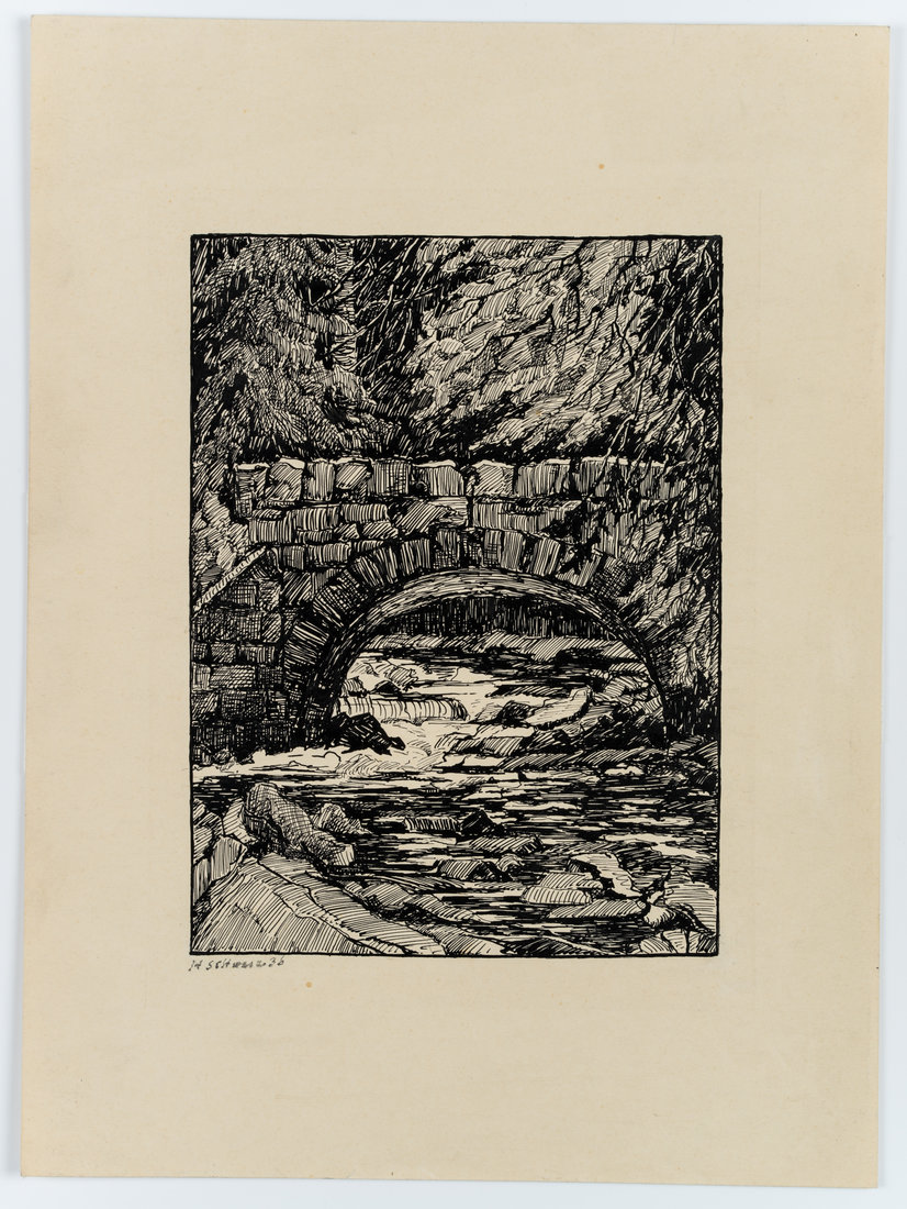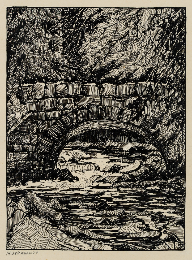 Helene Wilcky (20th century), Brook bridge near Elend in the Harz Mountains, rapids under stone bridge, 1936, Pen drawing