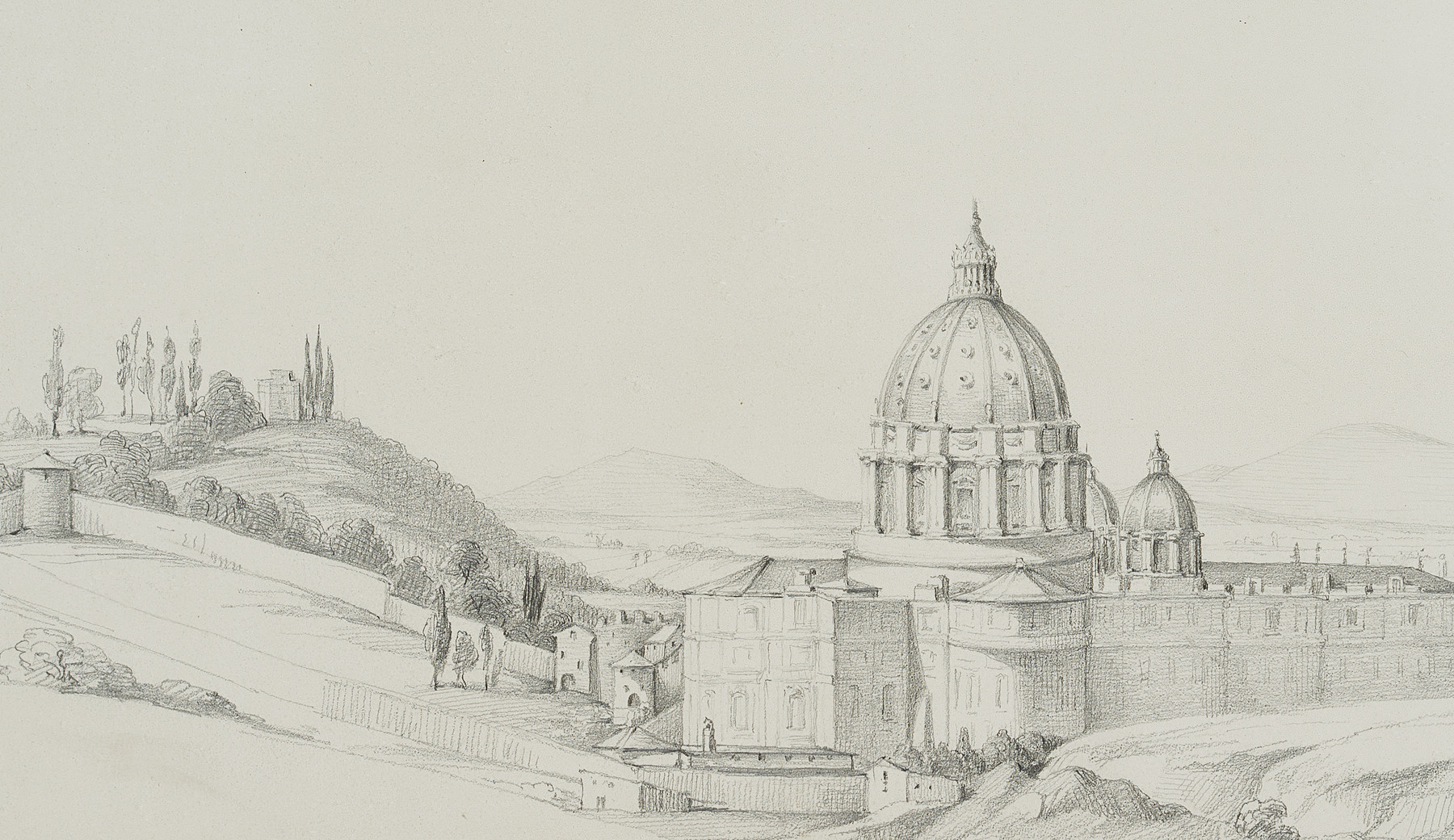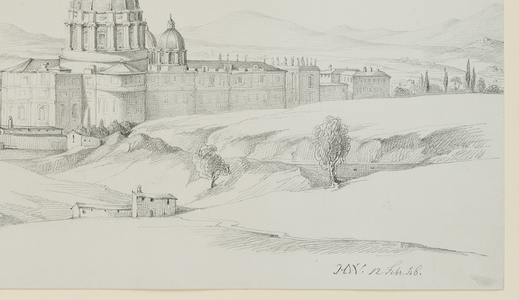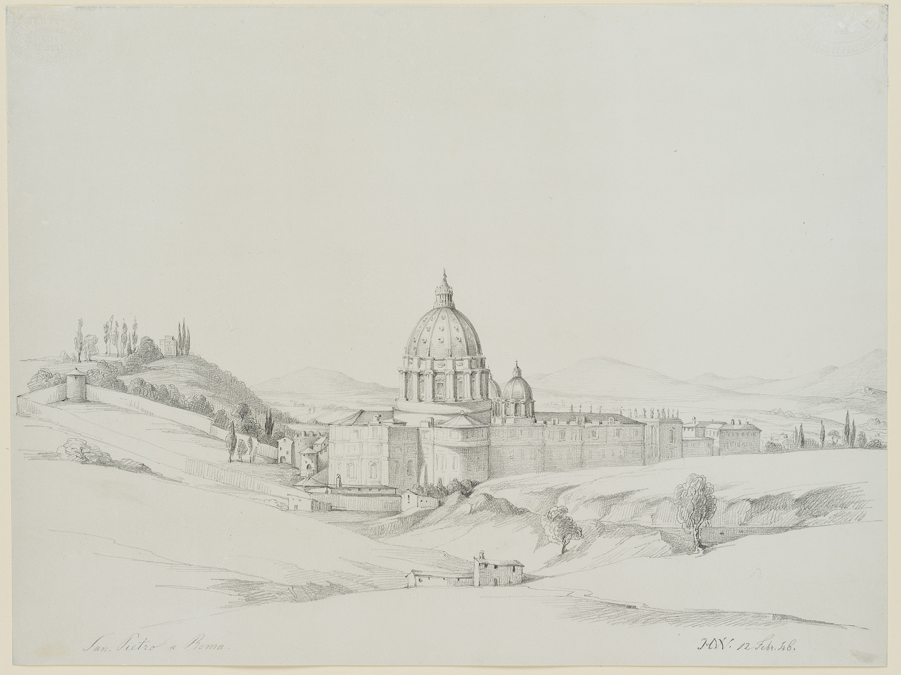 Heinrich Wilhelmi (1816 Xanten – 1902 Düsseldorf), Blick auf Sankt Peter in Rom, 1846, Bleistift