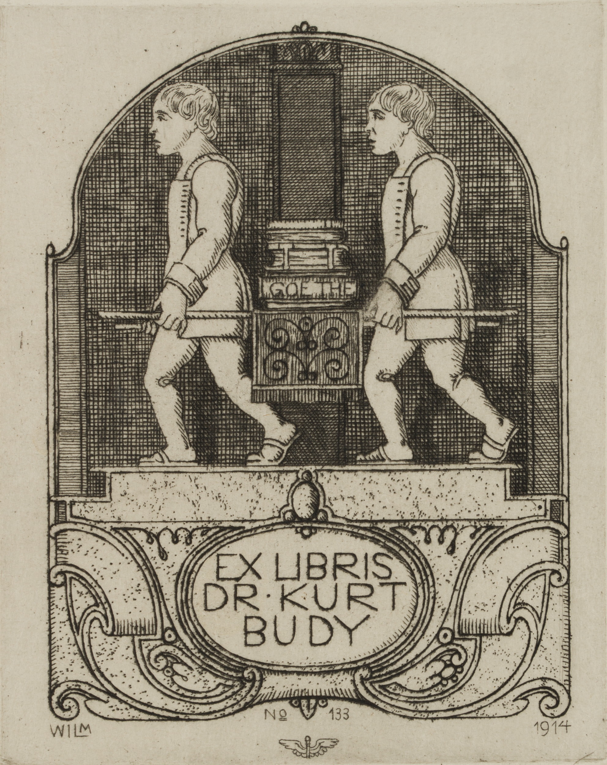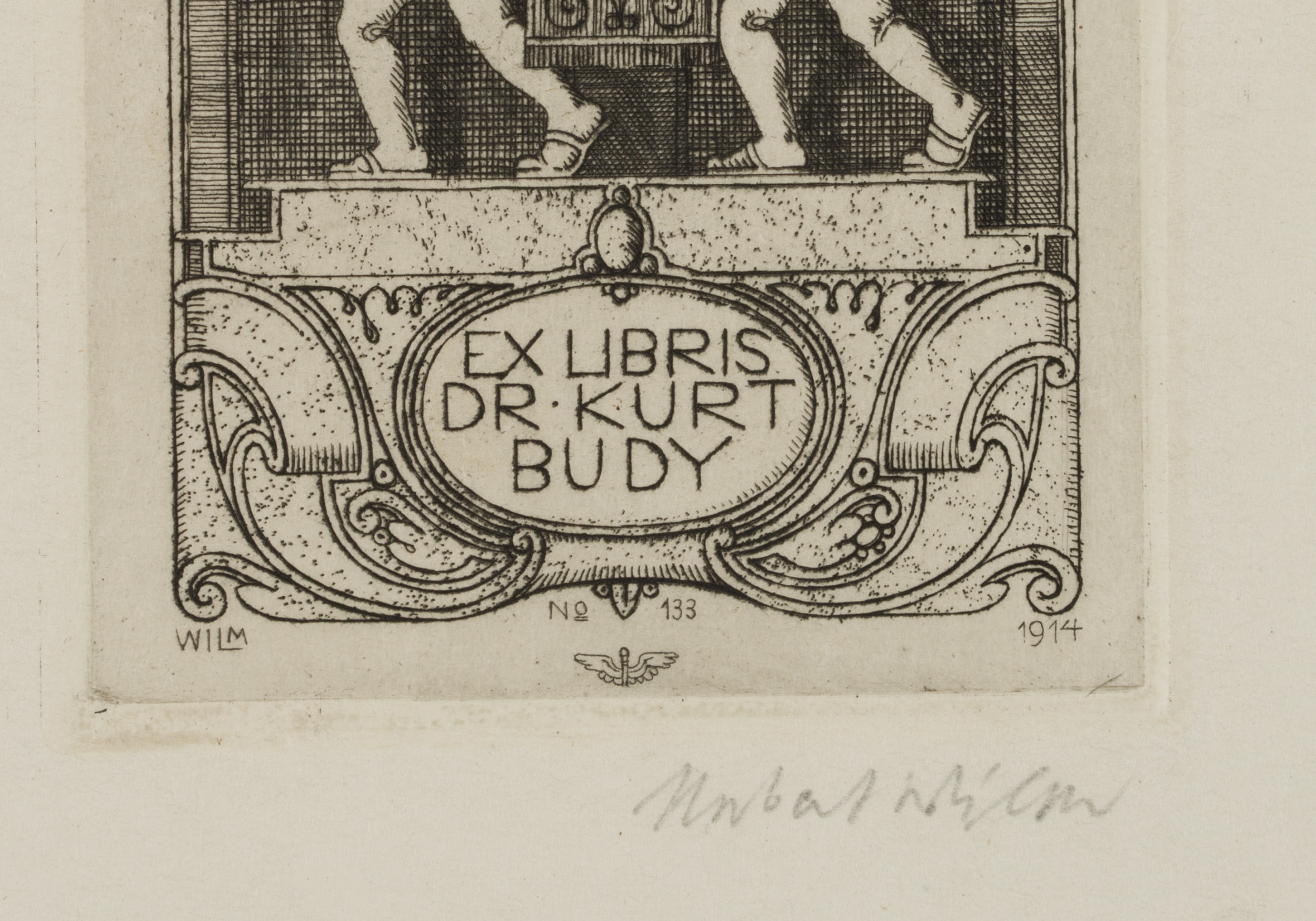 - Bezeichnung: Unten rechts signiert: “Hubert Wilm”. Mittig im Druck bezeichnet: “Ex Libris Dr Kurt Budy”. Unten mittig im Druck nummeriert: “No 133”.