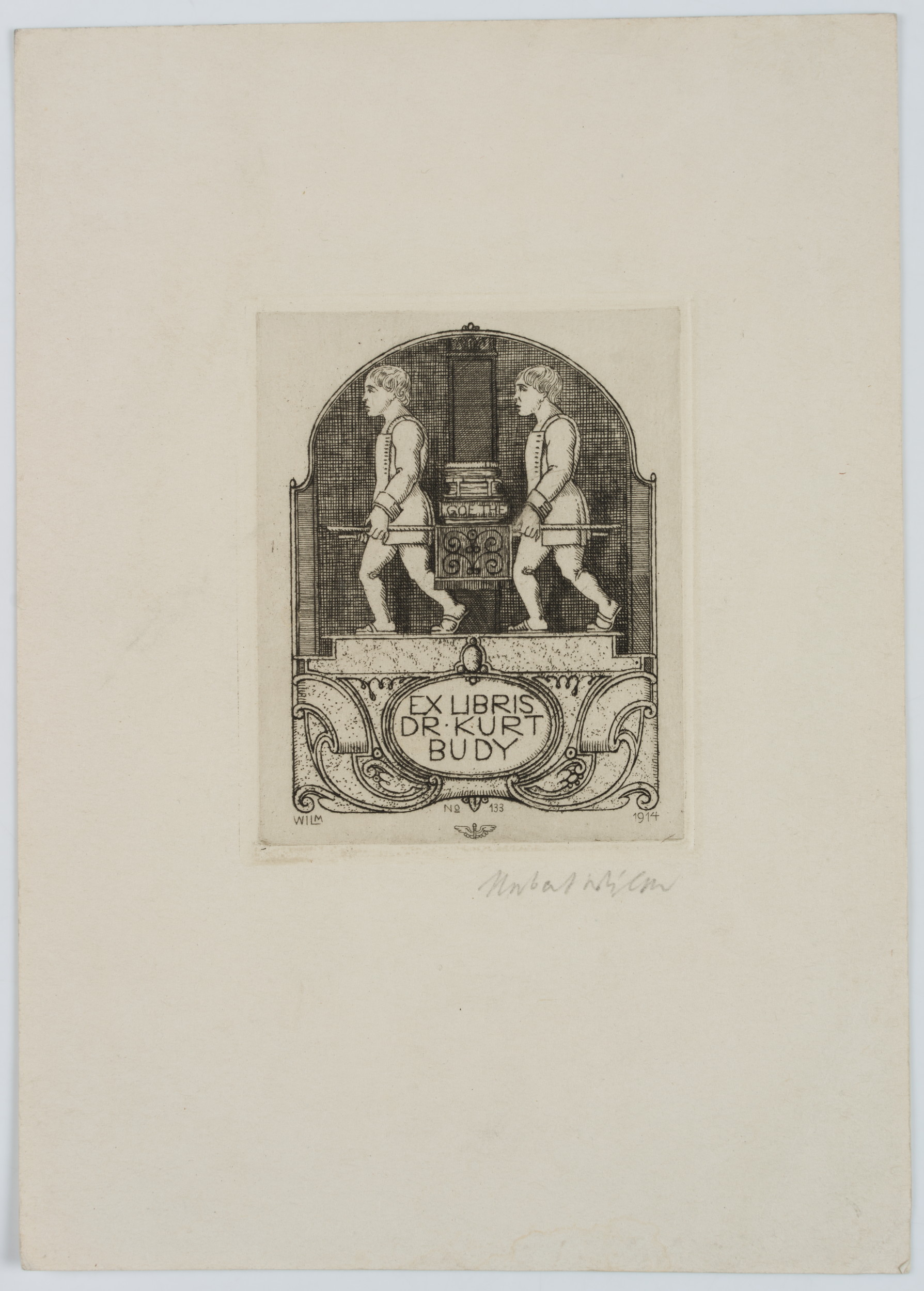 - Inscription: Lower right signed: “Hubert Wilm”. At the center inscribed in the printing plate: “Ex Libris Dr Kurt Budy”. Lower middle numbered in the printing plate: “No 133”.