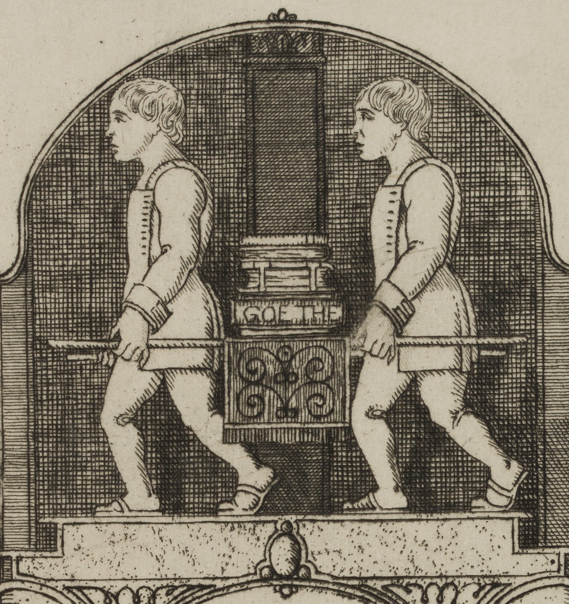 - Description: With a bier carried by two men. On top of it a column whose base bears the inscription “Goethe”.