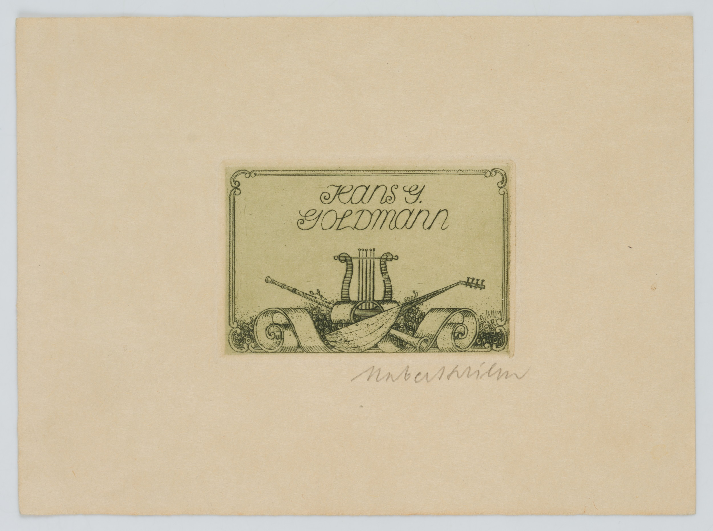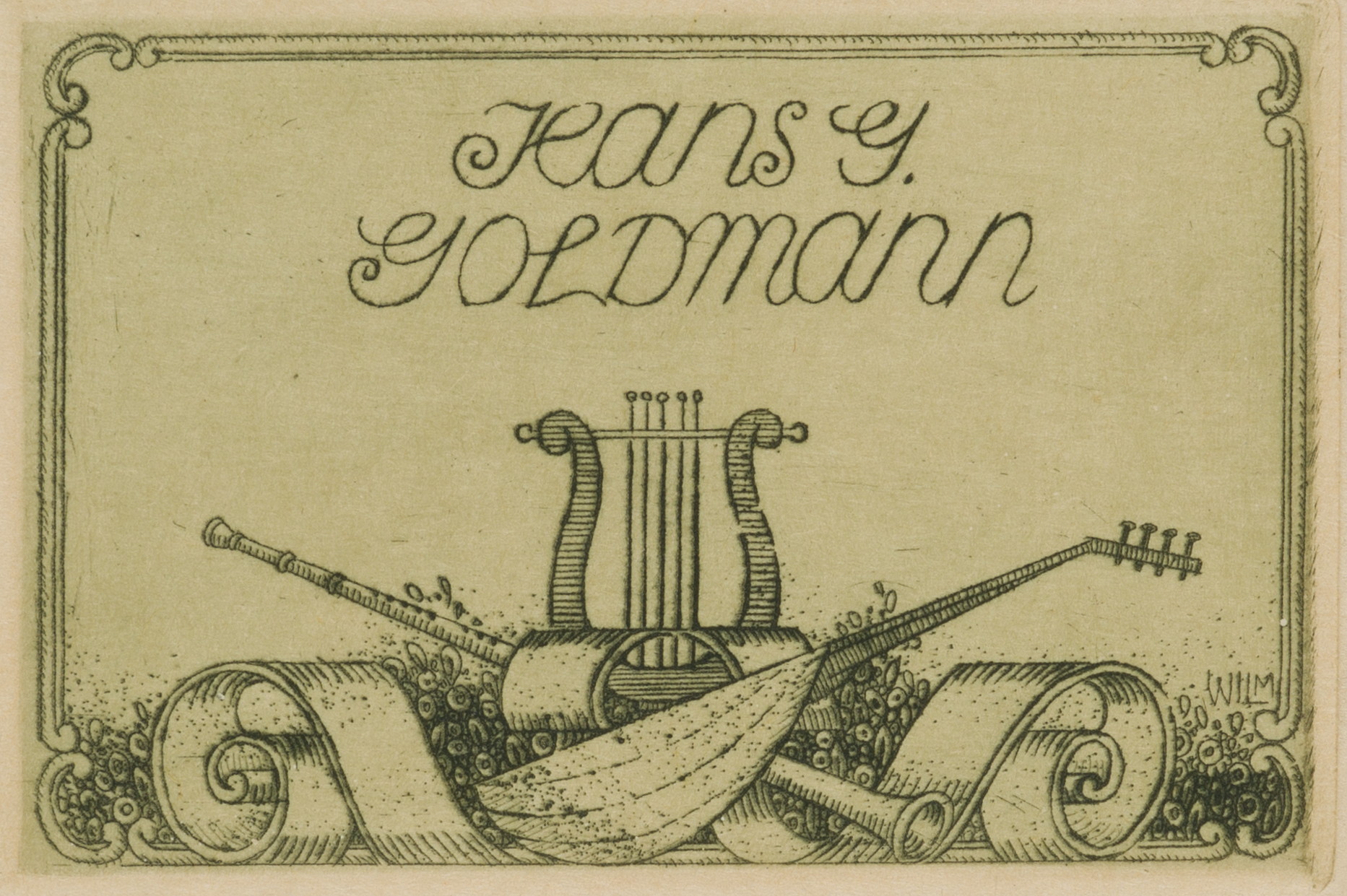 Hubert Wilm (1887 Kaufbeuren – um 1947 ), Exlibris für Eigner Hans G. Goldmann mit Arrangement aus Instrumenten, um 1920, Farbradierung