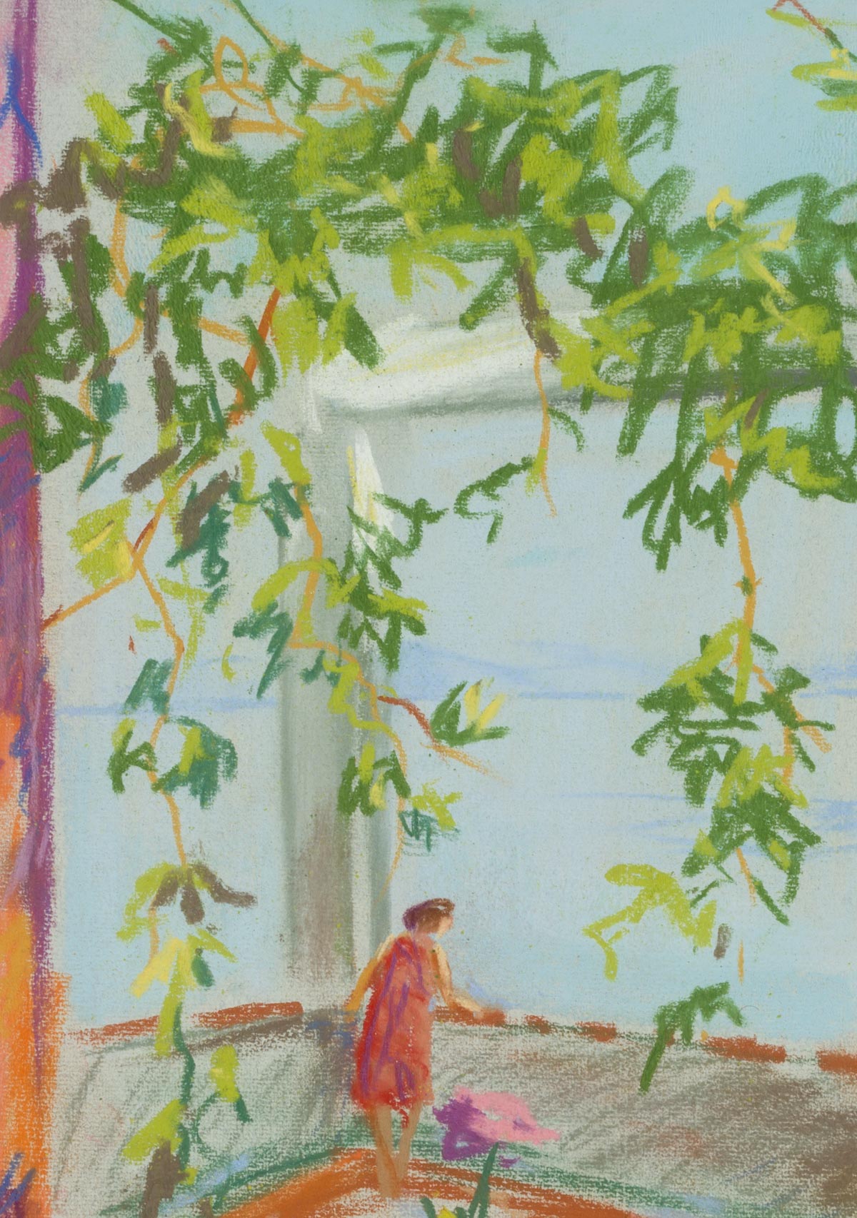 - Beschreibung: Aus einiger Distanz blicken die Betrachtenden auf eine große Terrasse, die von einer begrünten Pergola überfangen ist. Im Vordergrund die Darstellung einer Blume, die unmittelbar zu einer Figur im Mittelgrund verweist. Dort steht an der Brüstung einer Frau, die wohl den Blick auf das Meer genießt.