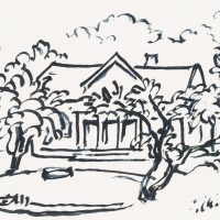 Hans Hugo Wingler (1896 Freiburg im Breisgau – 1981 Oberkirch), Blick auf den Gylliby-Gutshof, freistehend von Bäumen umsäumt. Schweden, 1962, Filzstift