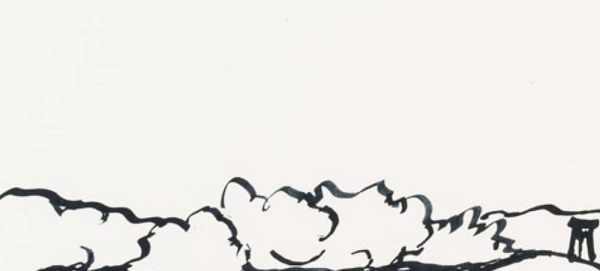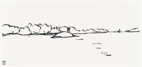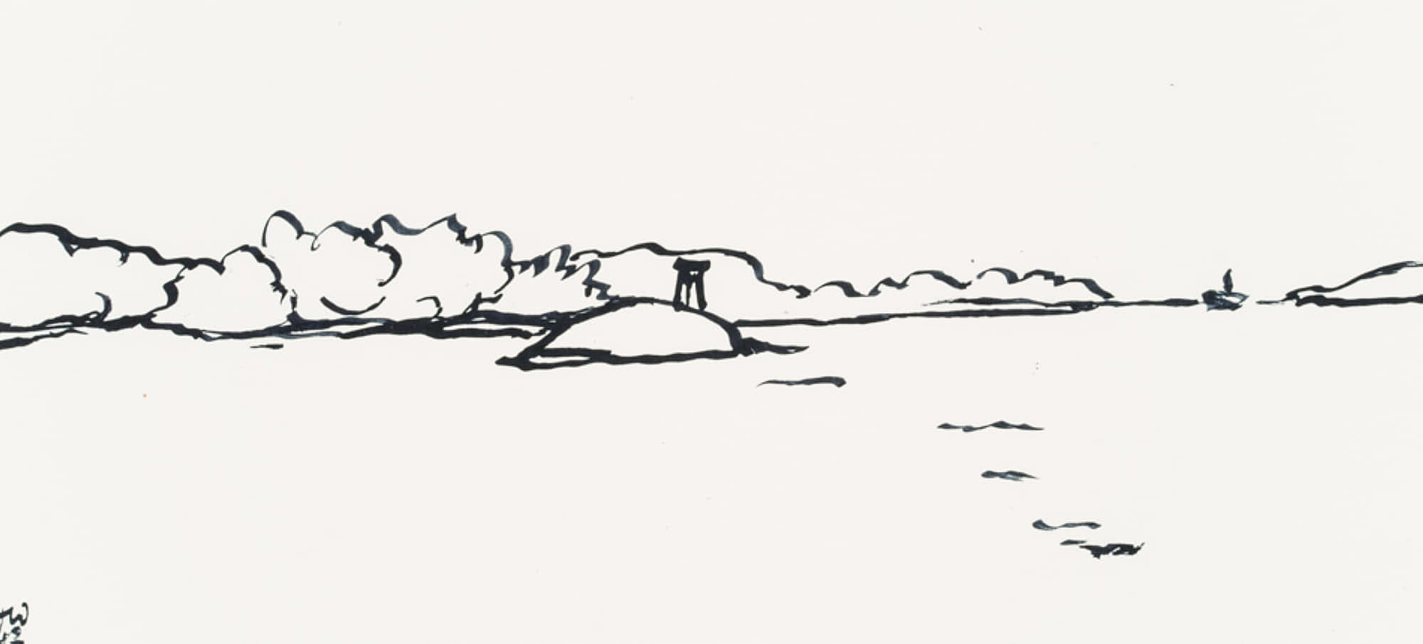 Hans Hugo Wingler (1896 Freiburg im Breisgau – 1981 Oberkirch), View over calm water to archipelago island with observation tower, 1962, Felt-tip pen