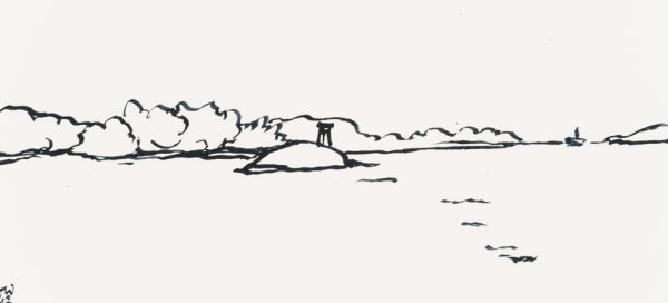 Hans Hugo Wingler (1896 Freiburg im Breisgau – 1981 Oberkirch), Blick über ruhiges Wasser auf Schäreninsel mit Aussichtsturm, 1962, Filzstift