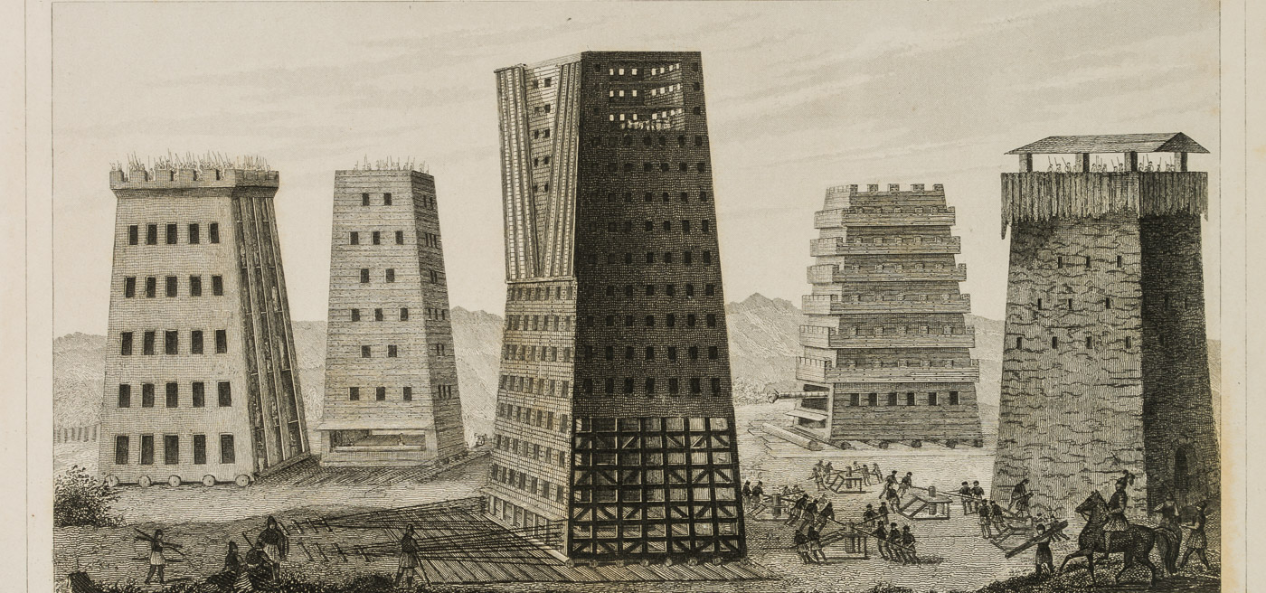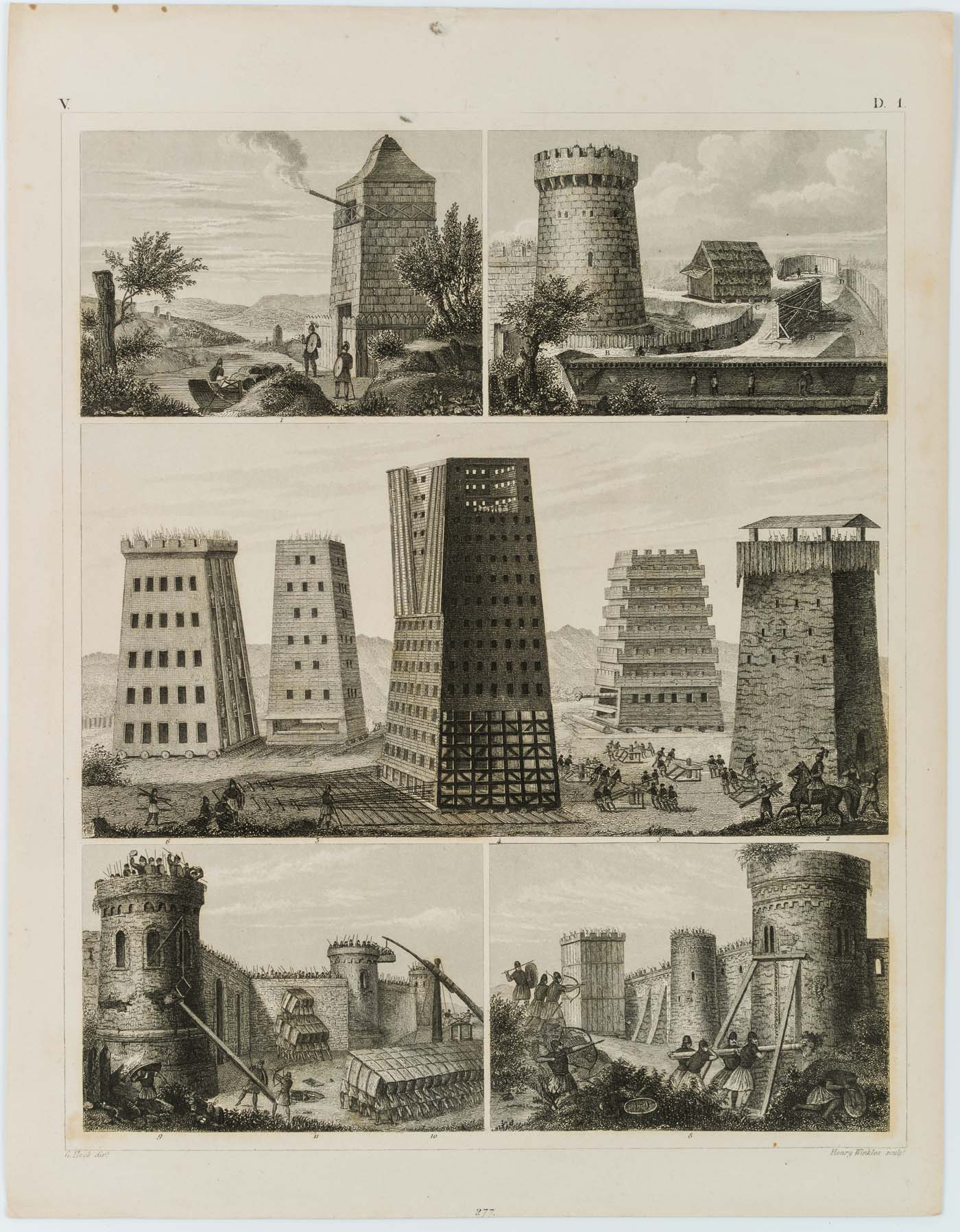 - Description: Illustration of various architectural concepts of defence towers. Among them are both wooden and masonry defence towers. To illustrate this, smaller troops and figures are shown defending their position with the help of the defence towers or attacking them.