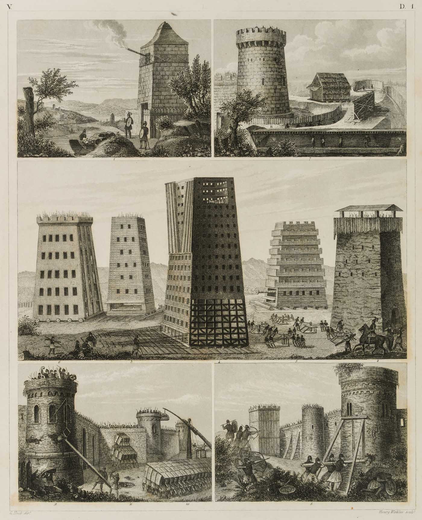 Henry Winkles (1801 – 1860 ), Illustration of defence towers, 19th century, Steel engraving