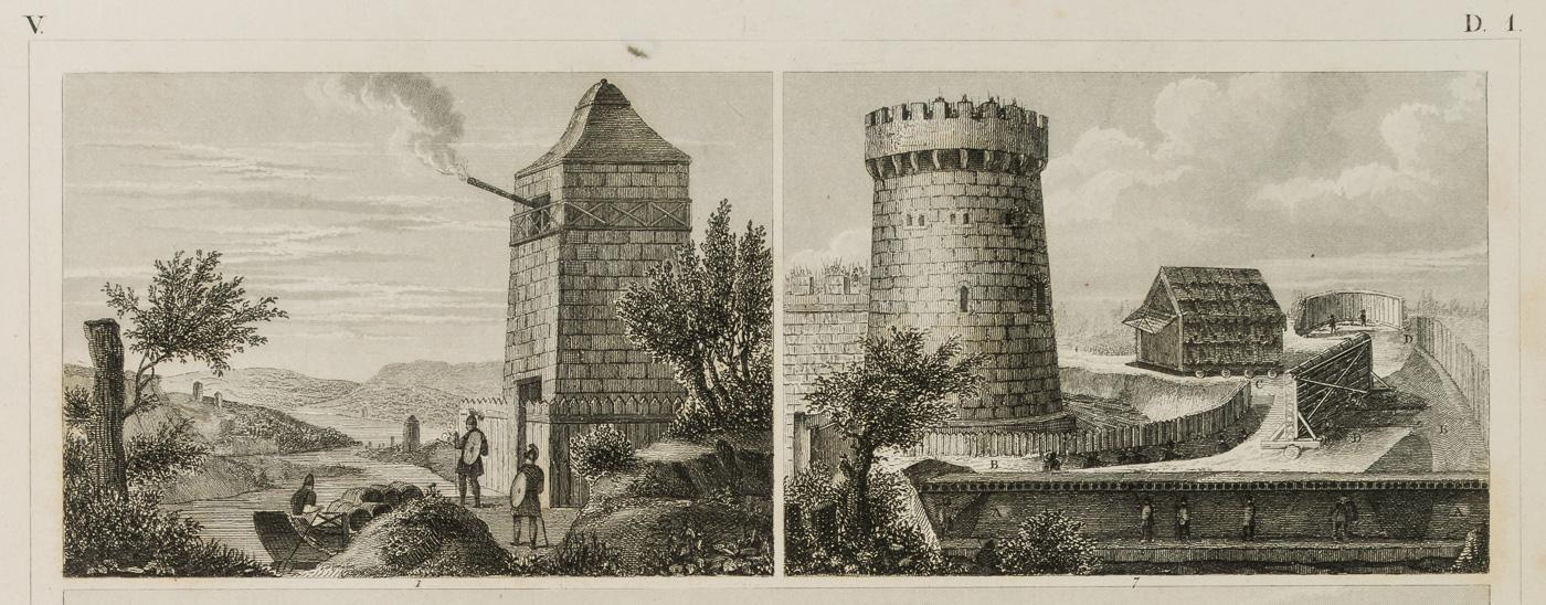 - Beschreibung: Illustration verschiedener architektonischer Konzeptionen von Wehrtürmen. Darunter hölzerne wie gemauerte Wehrtürme. Zur Veranschaulichung sind kleinere Truppen und Figuren zu sehen, die mit Hilfe der Wehrtürme ihre Stellung verteidigen, oder diese angreifen.