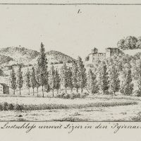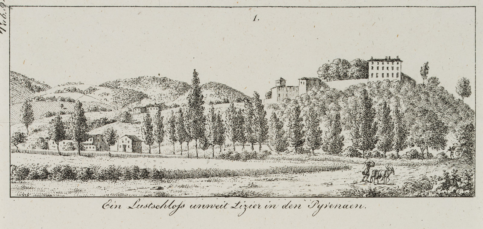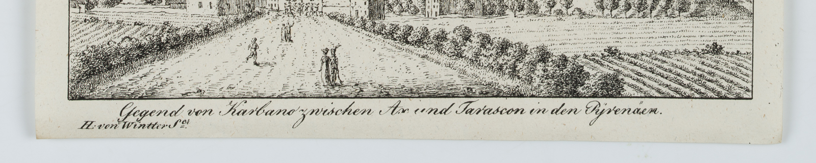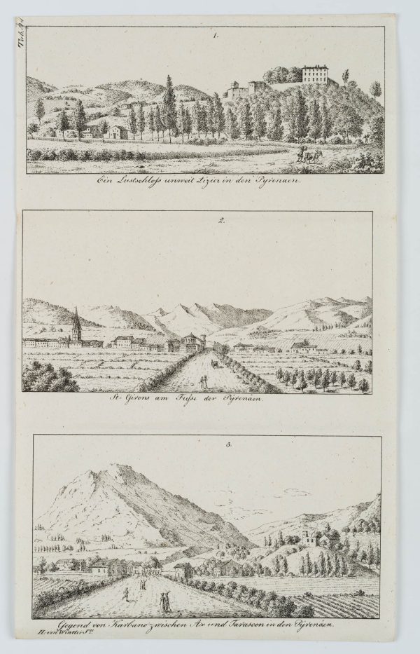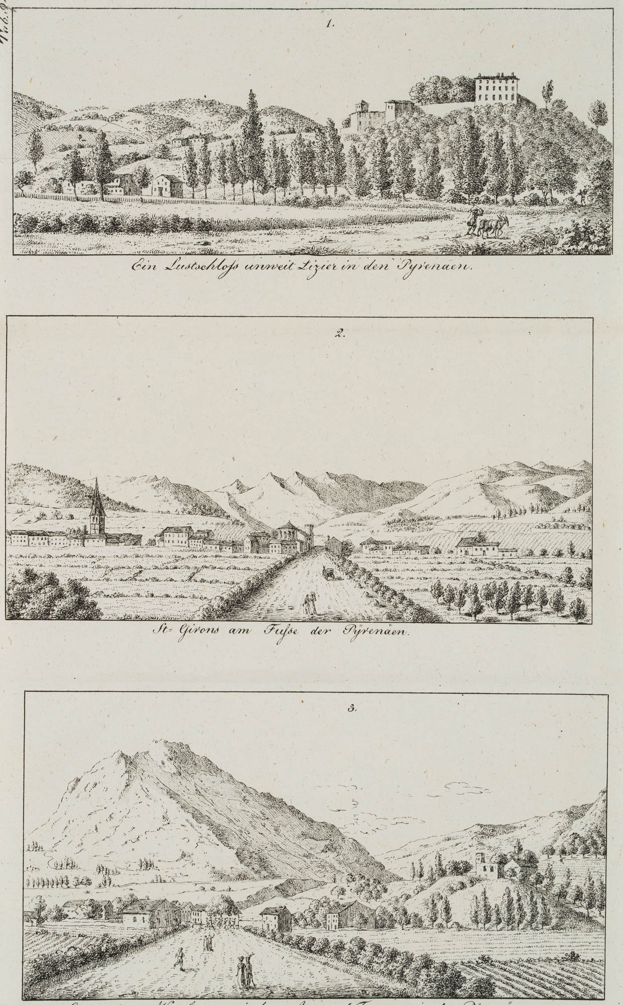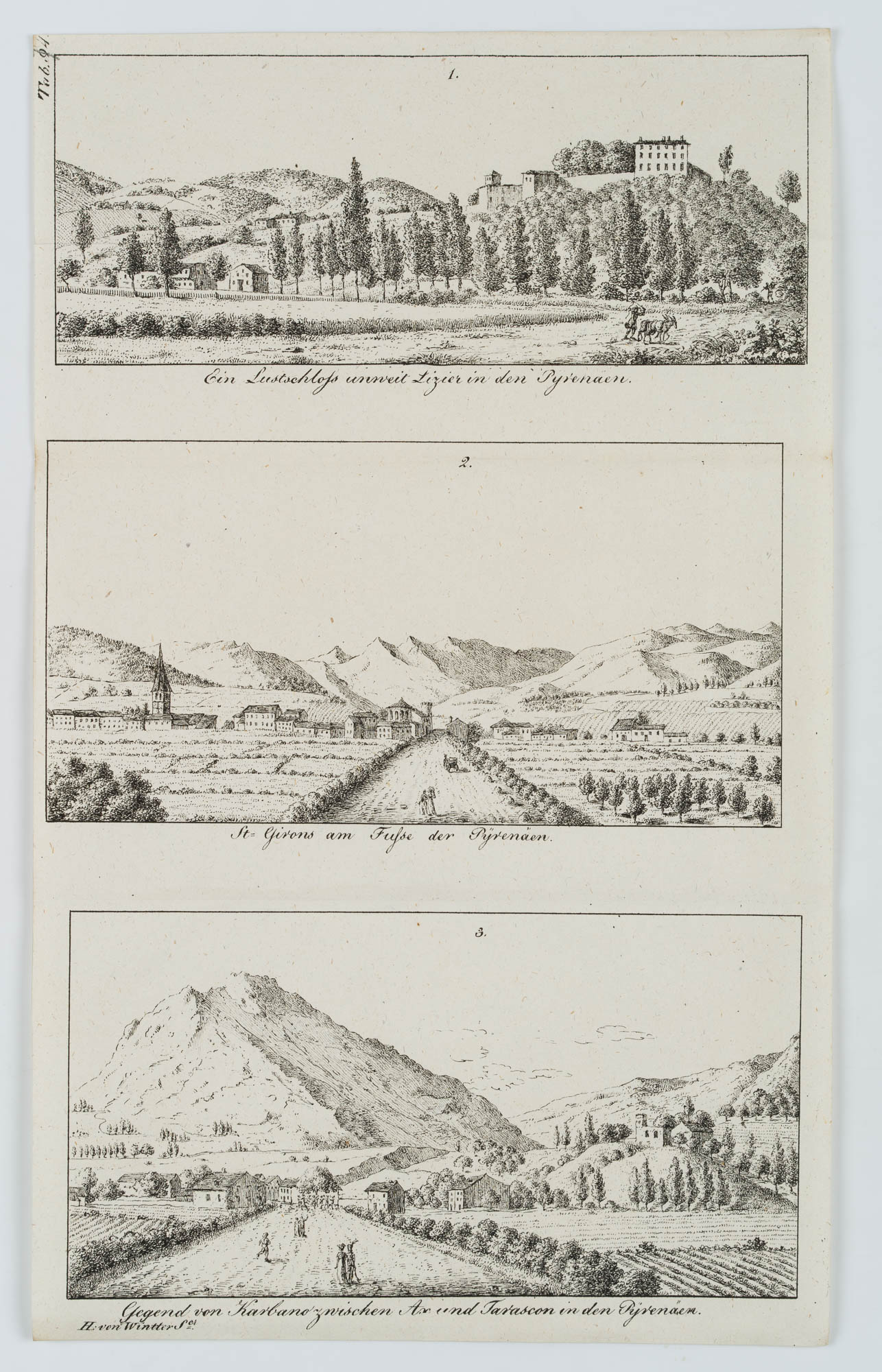 H. von Winther (19. Jahrhundert), Drei Landschaftsansichten von den Pyrenäen: Lustschloss unweit Lizier; St. Girons am Fuße der Pyrenäen; Gegend von Karbano zwischen Ax und Farascon, um 1800, Federlithographie