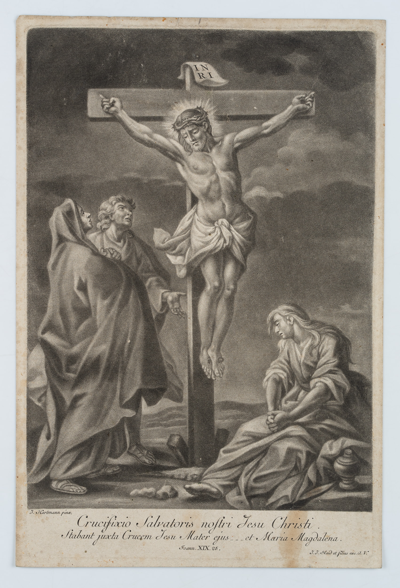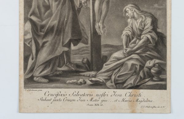 - Inscription: Lower middle further inscription: “Crucifixio Salvatoris nostri Jesu Christi. / Stabant juxta Crucem Jesu Mater ejus et Maria Magdalena / Joann. XIX. 25 / J. J. Haid et filius exc. A. V.”.