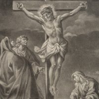 - Condition: Good condition. The sheet has age-appropriate dust stains and shows discolouration. Brownish discolourations are visible especially in the written part below the graphic. The image is slightly worn at the crossbar of the cross and above as well as at Mary’s cloak with small missing parts. The sheet has been trimmed 0.6cm from the platemark. The edge is only minimally worn and has no tears or creases.