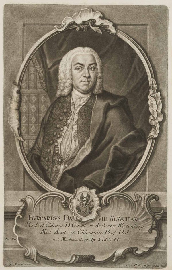 Johann Jakob Haid (1704 Kleineislingen – 1767 Augsburg) after Wolfgang Dietrich Majer (1698 Hohenstein – 1762 Tübingen), Portrait of the physician Burkhard David Mauchart, 18th century, Mezzotint
