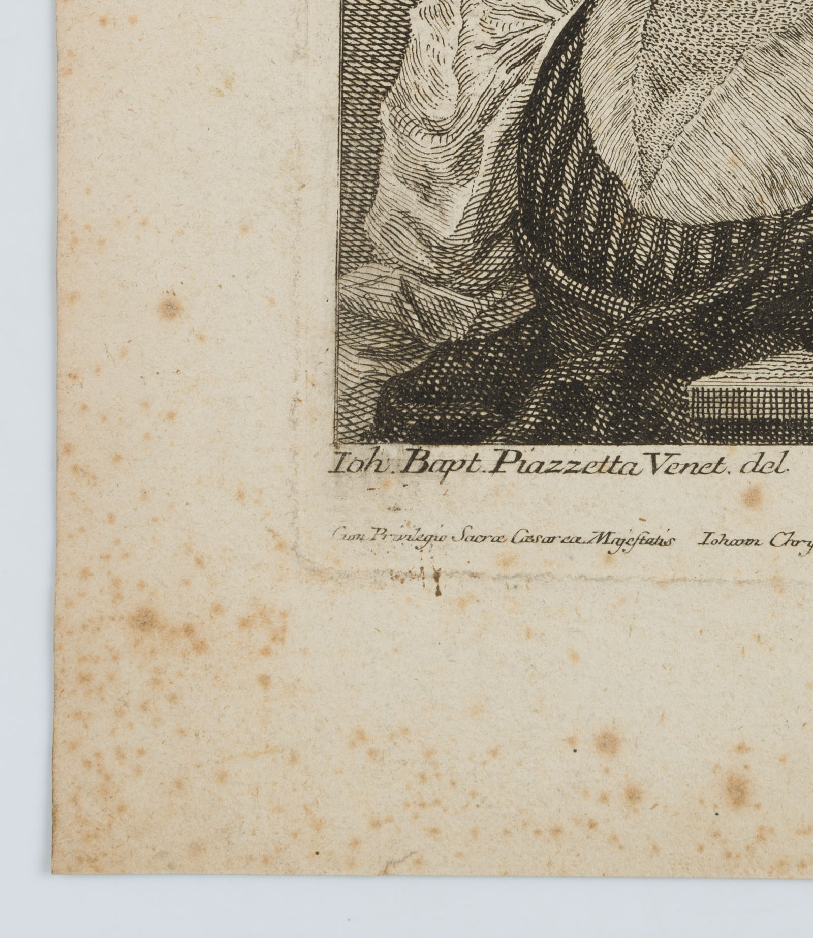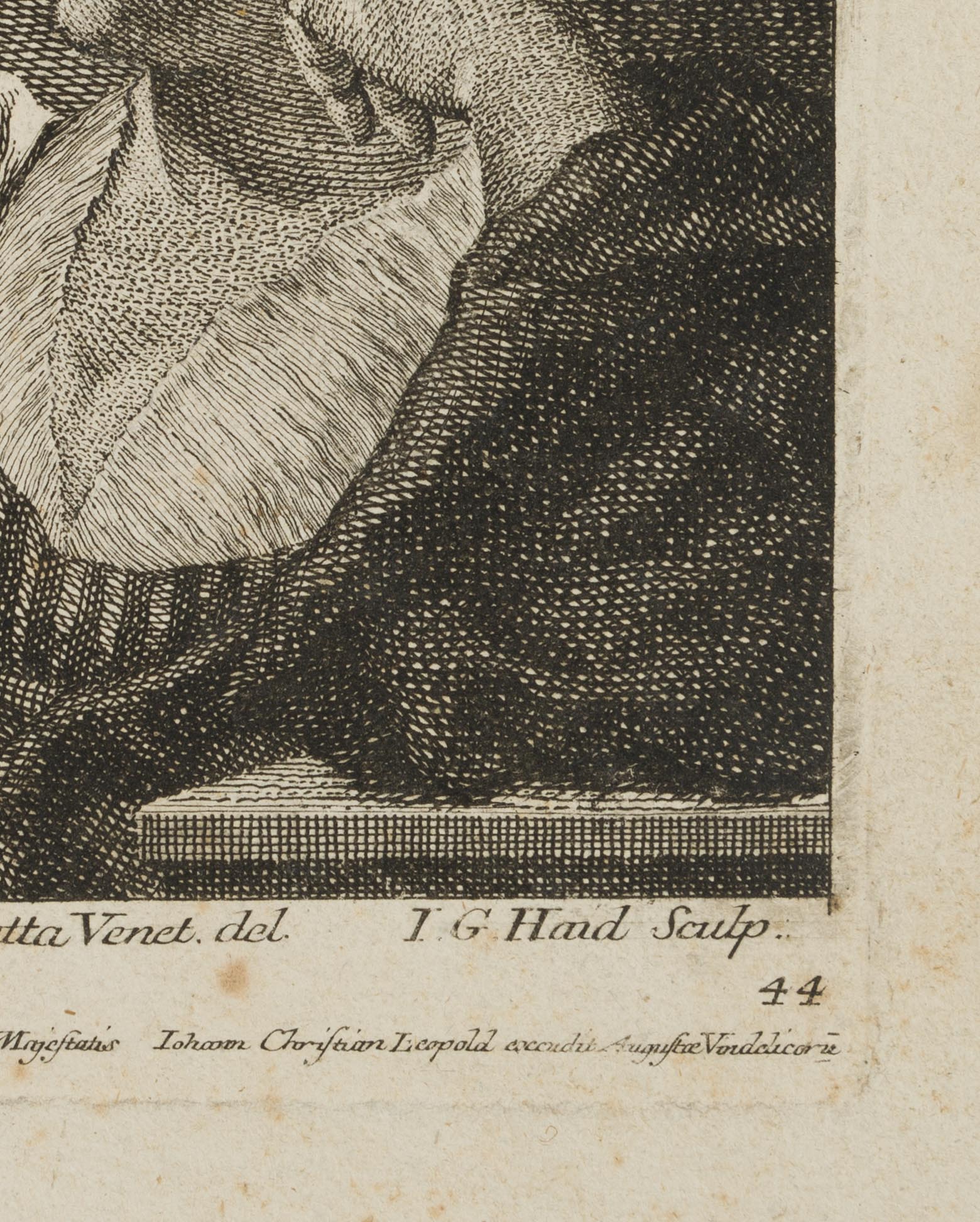 - Bezeichnung: Unterhalb der Darstellung in der Druckplatte signiert mit “Ioh. Bapt. Piazzetta Venet. del. | I G Haid sculp”, darunter nummeriert mit 44.