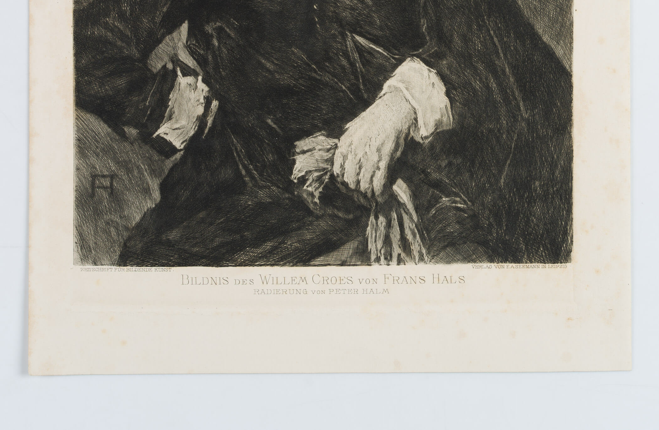 • Inscription: Lower middle signed in the printing plate: “Zeitschrift für bildende Kunst / Bildnis des Willem Croes von Frans Hals / Radierung von Peter Halm / Verlag von E.A. Seemann in Leipzig”.
