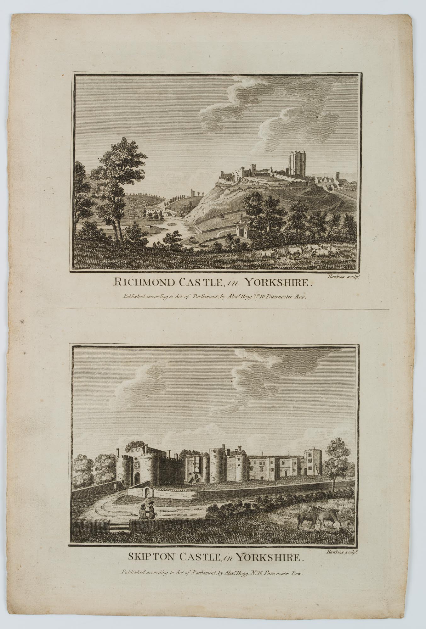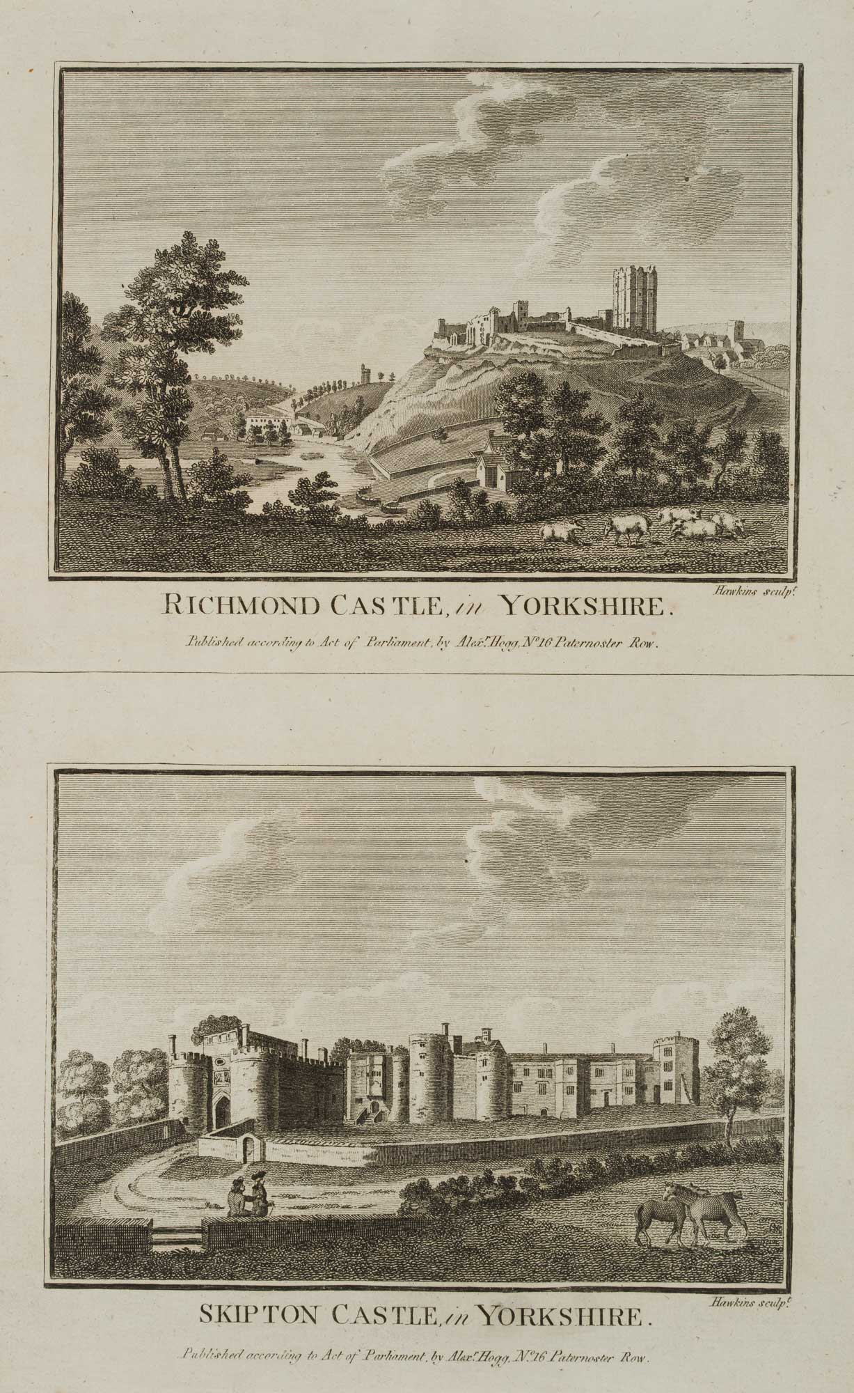 Hawkins (18th century), Two architectural and landscape depictions: “Richmond Castle, in Yorkshire”, “Skipton Castle, in Yorkshire”, 18th century, Etching