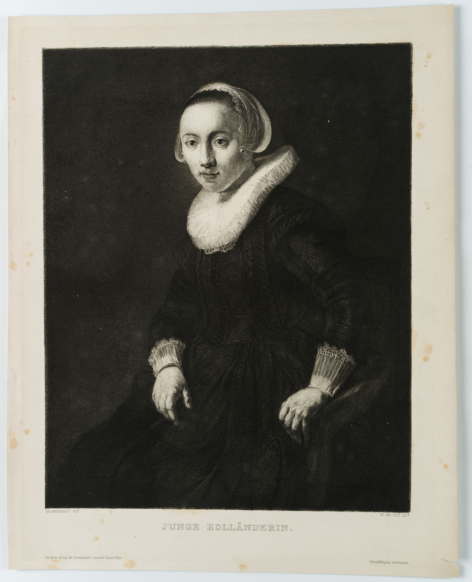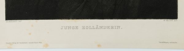 - Inscription: Signed “REMBRANDT PX” below the print on the left and “W. HECHT SC” on the right. Below titled with: “JUNGE HOLLÄNDERIN.”.