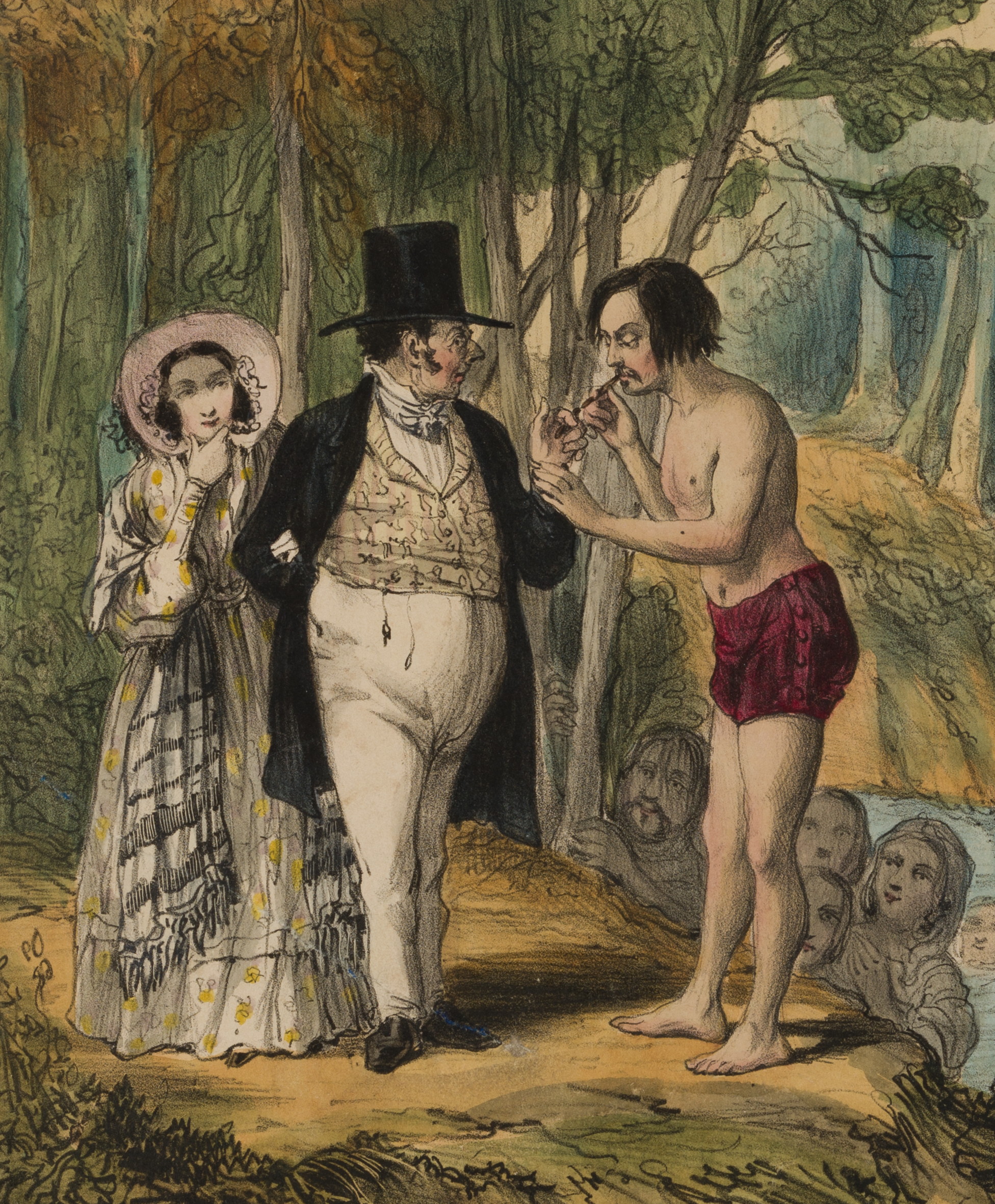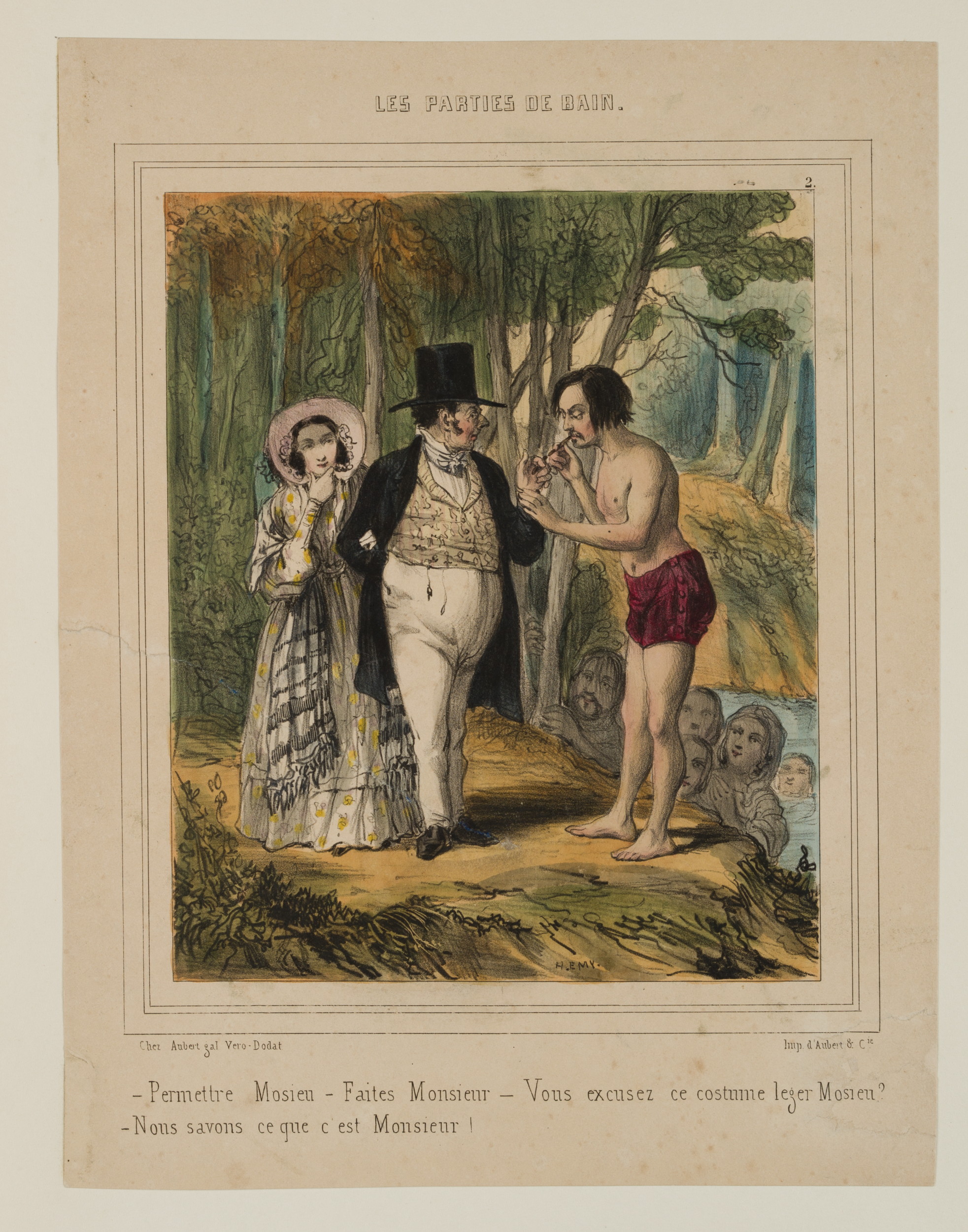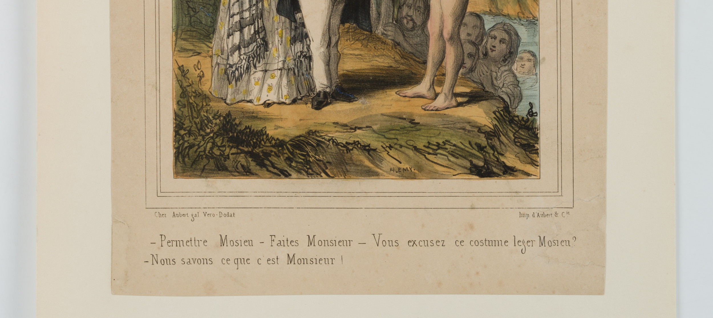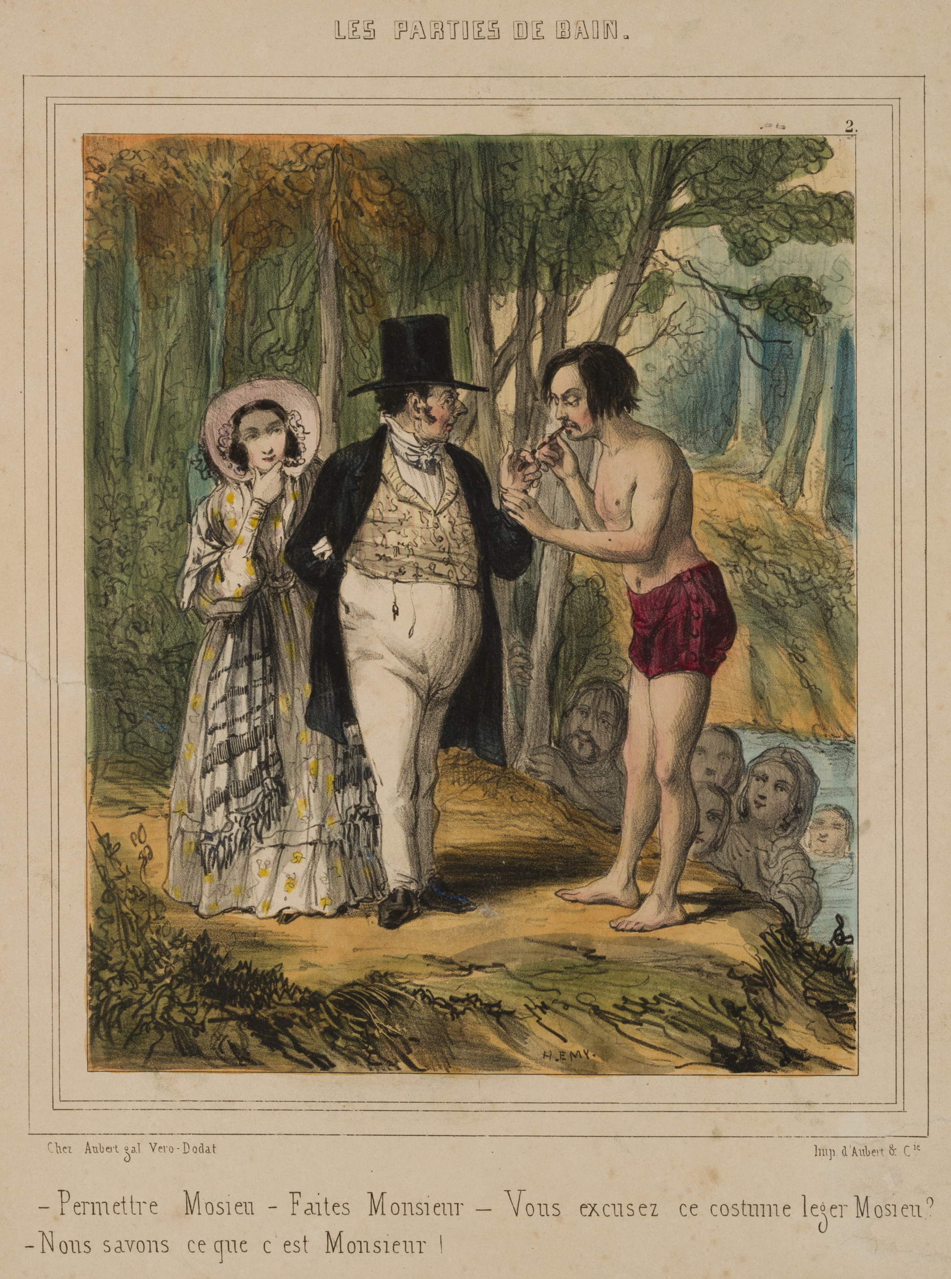 Henri Emy: Armand Louis Henri Télory (1820 – 1875 ), Karikatur. Badender bittet um Feuer, , Lithographie