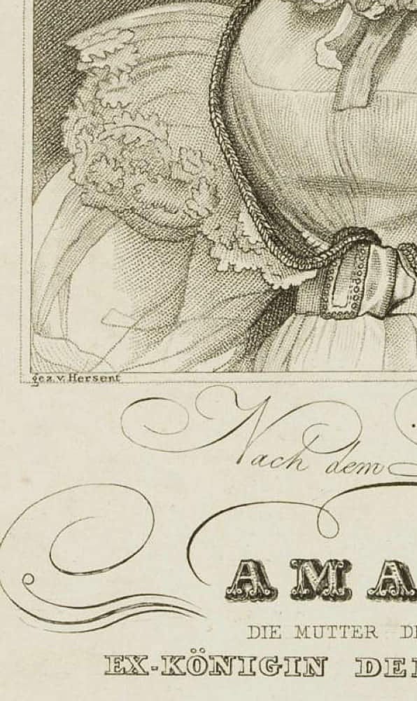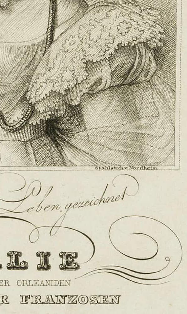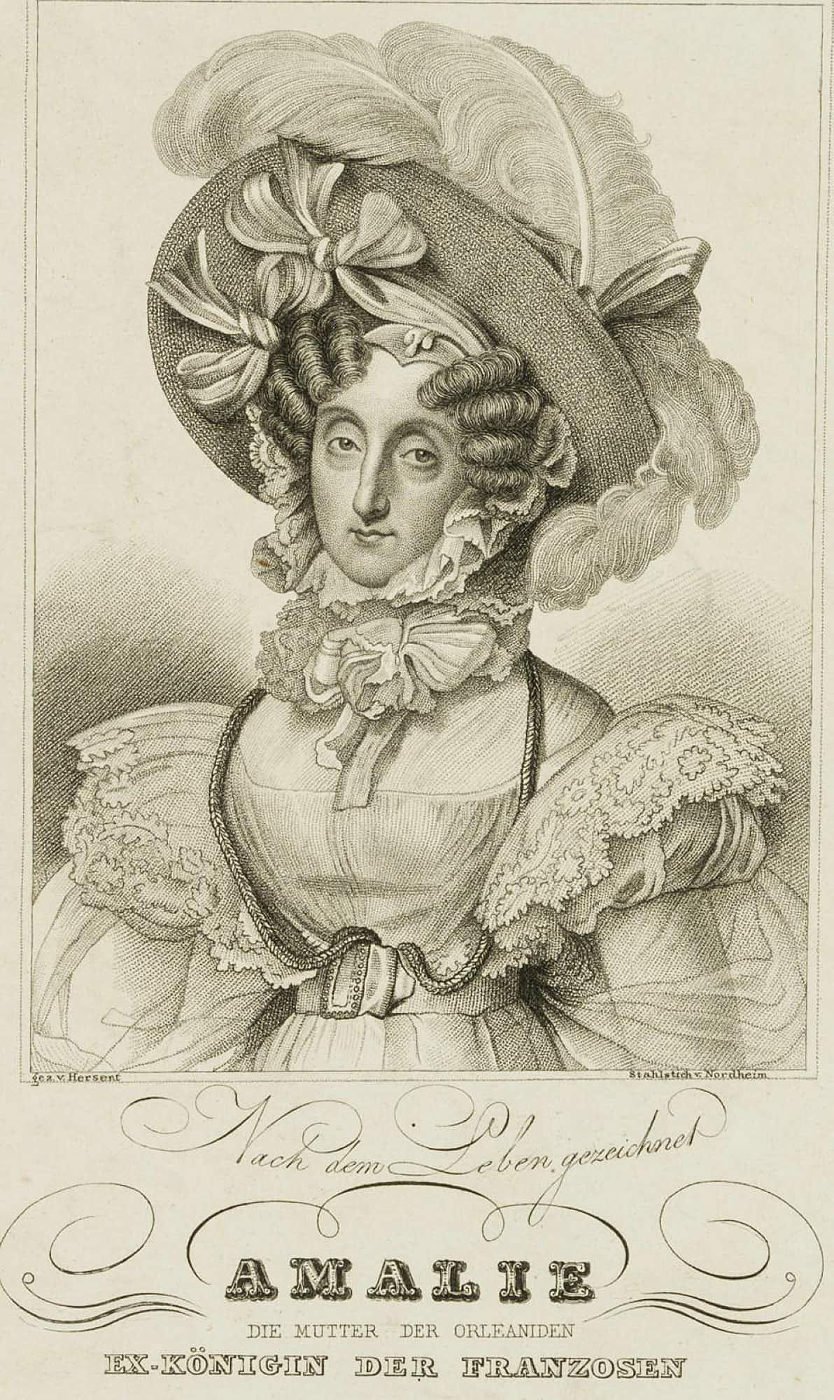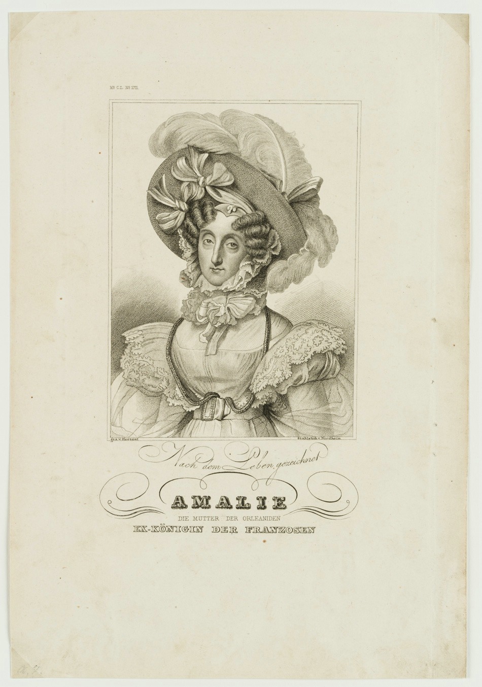 - Bezeichnung: Links unter dem Bild signiert mit “gez. v. Hersent” und rechts signiert mit “Stahlstich v. Nordheim”, darunter mit dem Namen der Dargestellten “AMALIE Die Mutter der Orleaniden EX-KÖNIGIN DER FRANZOSEN” bezeichnet.