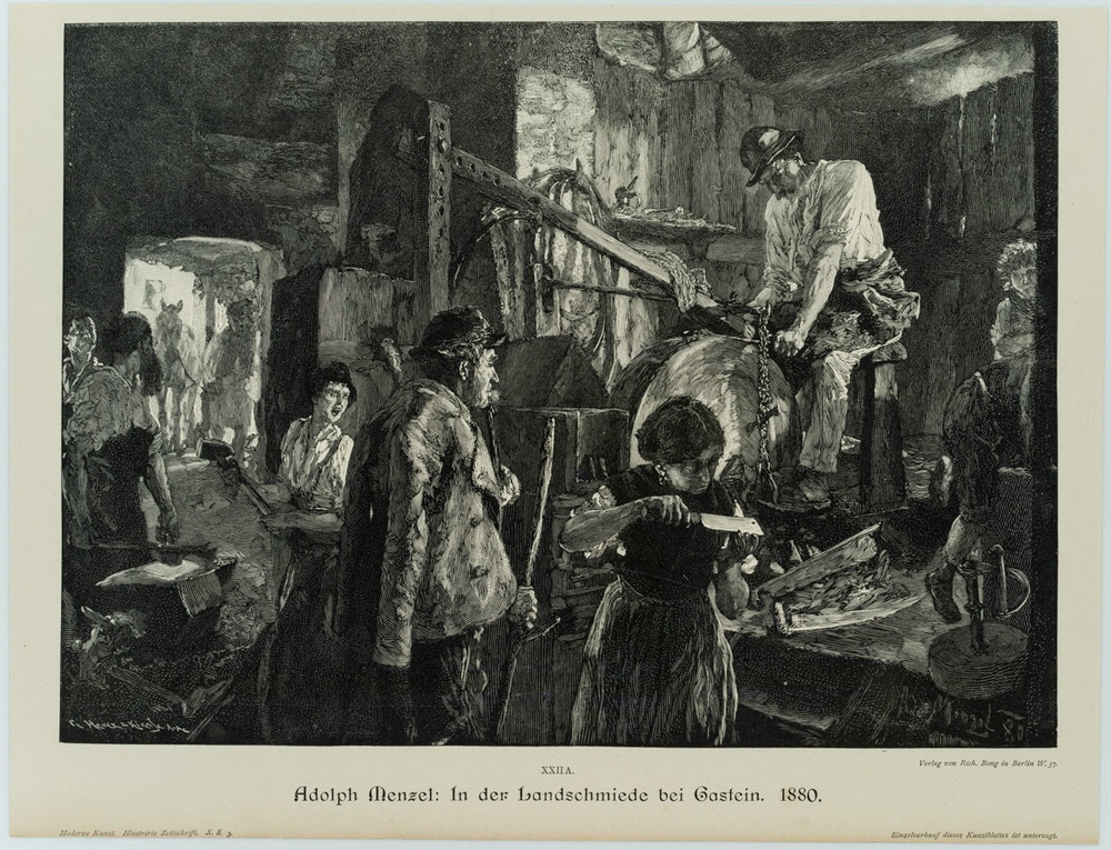 - Description: inscribed on the left “G Heuer (illegible) X.A.”, inscribed on the right “A. Menzel”, titled “Adolph Menzel: In der Landschmiede bei Gastein 1880”. Adolph von Menzel, important painter of 19th century realism, visited the village of Gastein, Austria, several times in the 1980s. After his observations of the rural population and their habits, he brought the working inhabitants to the fore. In “In der Landschmiede zu Gastein” (In the Country Forge at Gastein), viewers are invited into the interior of a village forge, where Menzel shows the workers at the grindstone and forging the hot iron.