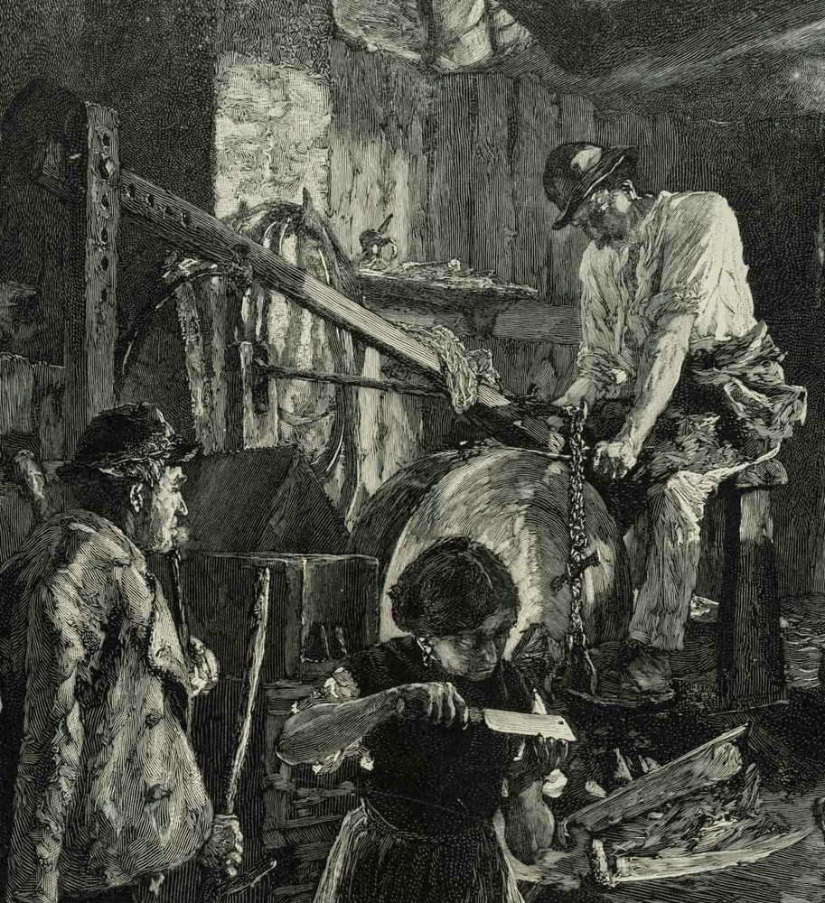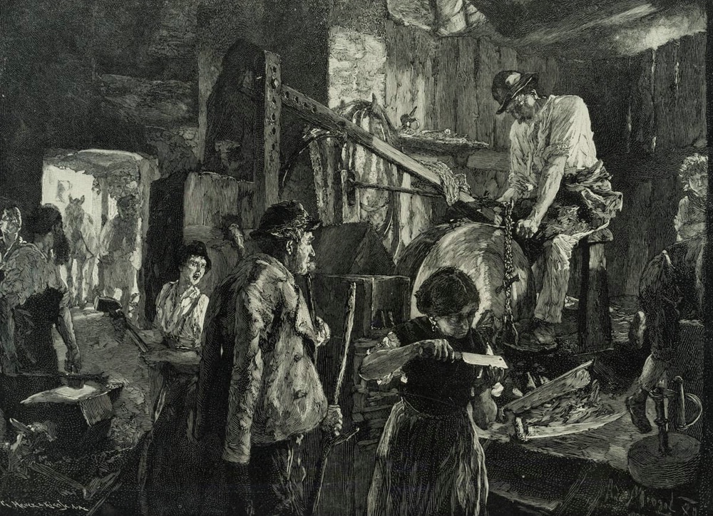 Gustav Heuer (19. Jahrhundert) nach Adolph Friedrich Erdmann von Menzel (1815 Breslau – 1905 Berlin), In der Landschmiede, 19. Jahrhundert, Holzstich