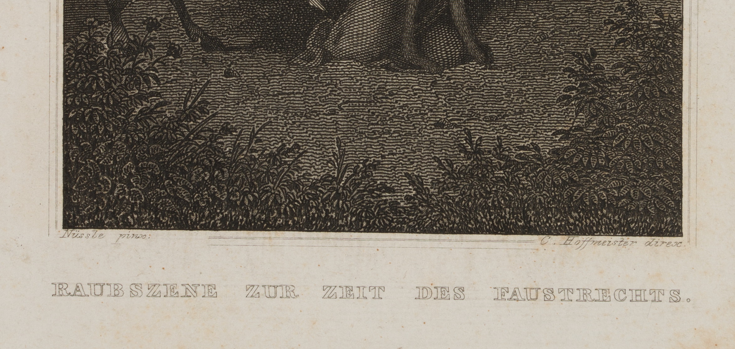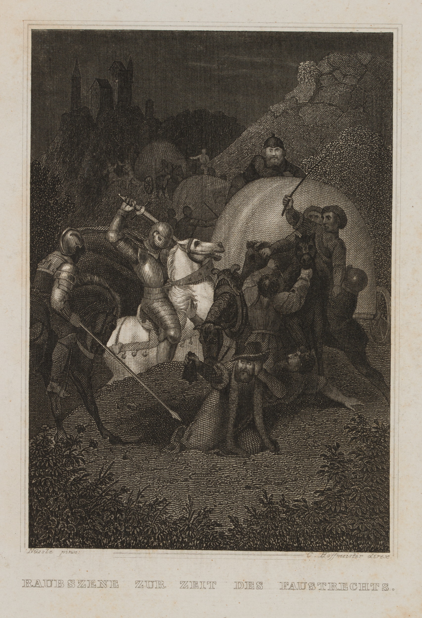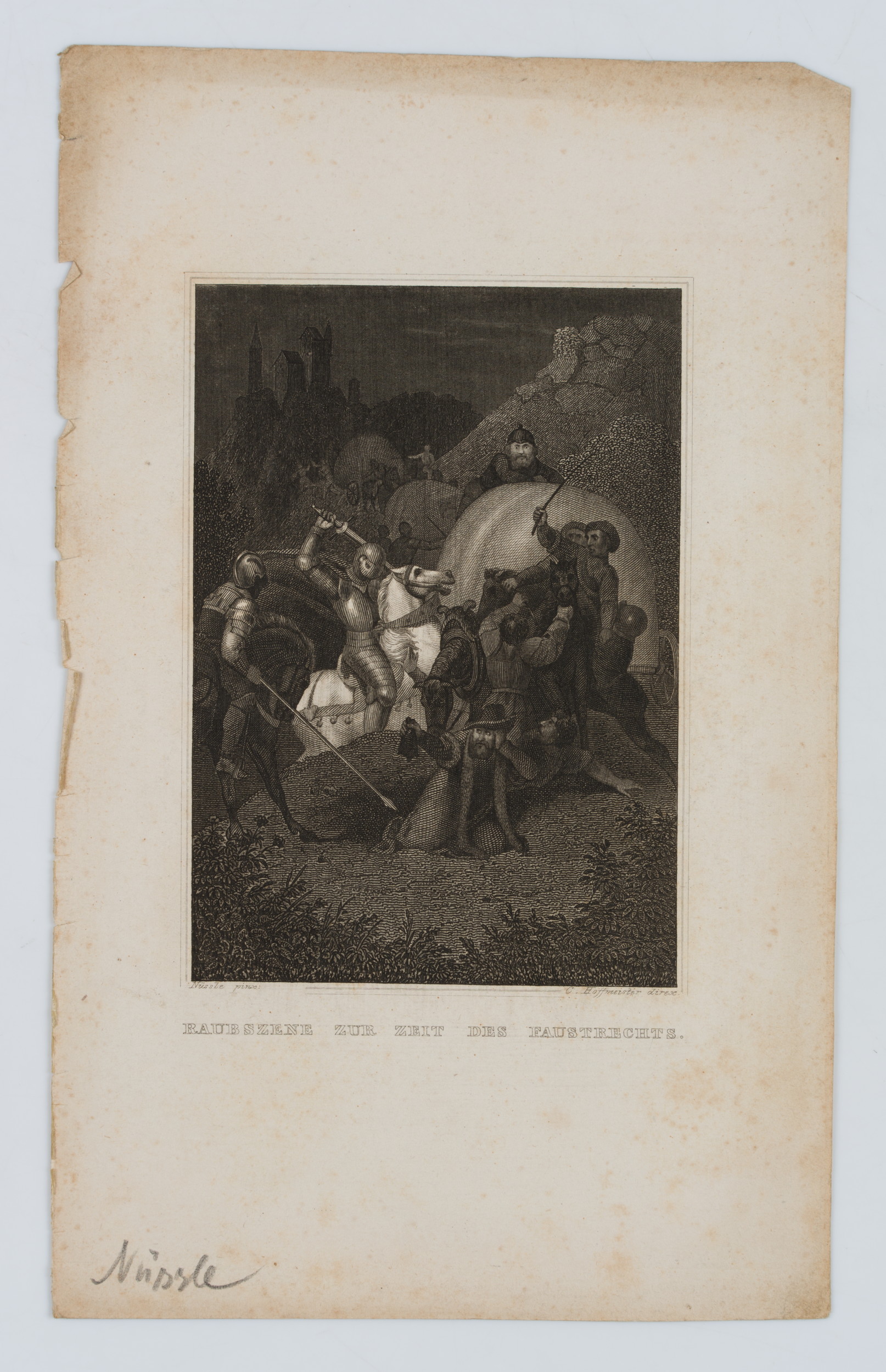 Christian Hoffmeister (1818 Karlsruhe – 1871 Frankfurt) nach Julius Nisle (*1812 Stuttgart), Raubszene zur Zeit des Faustrechts, 19. Jahrhundert, Stahlstich