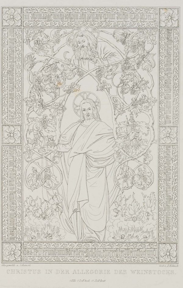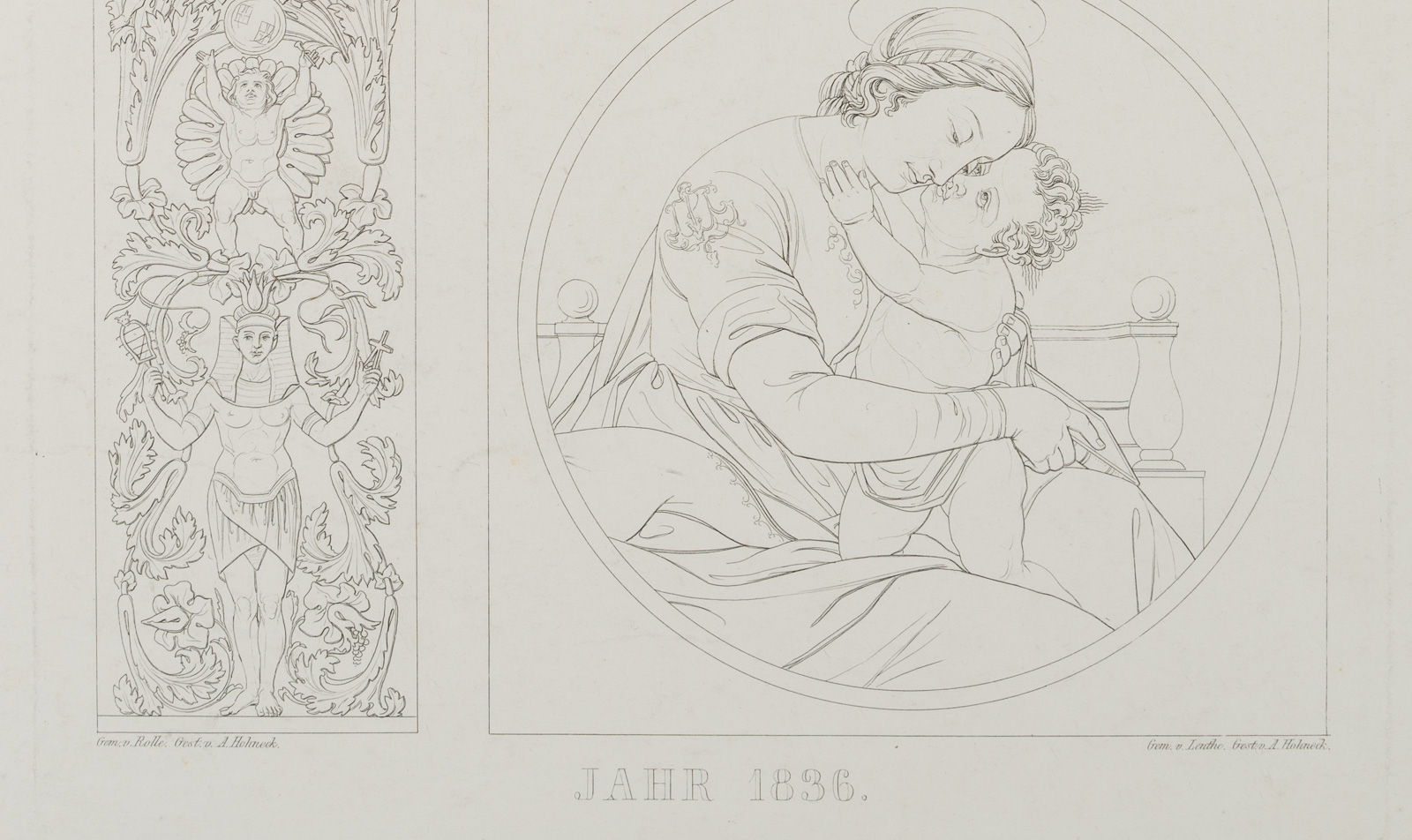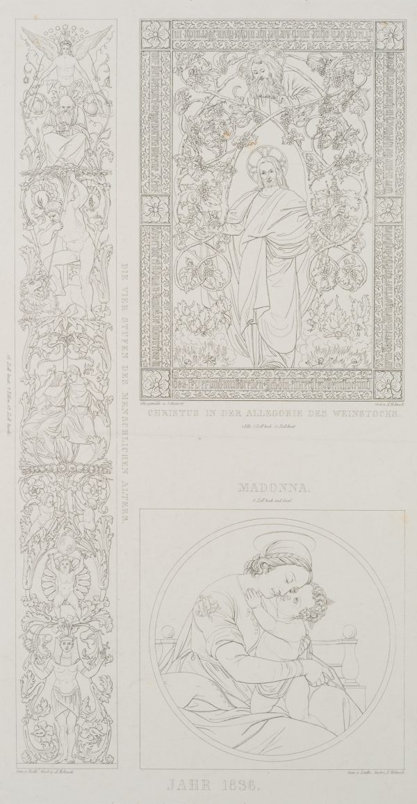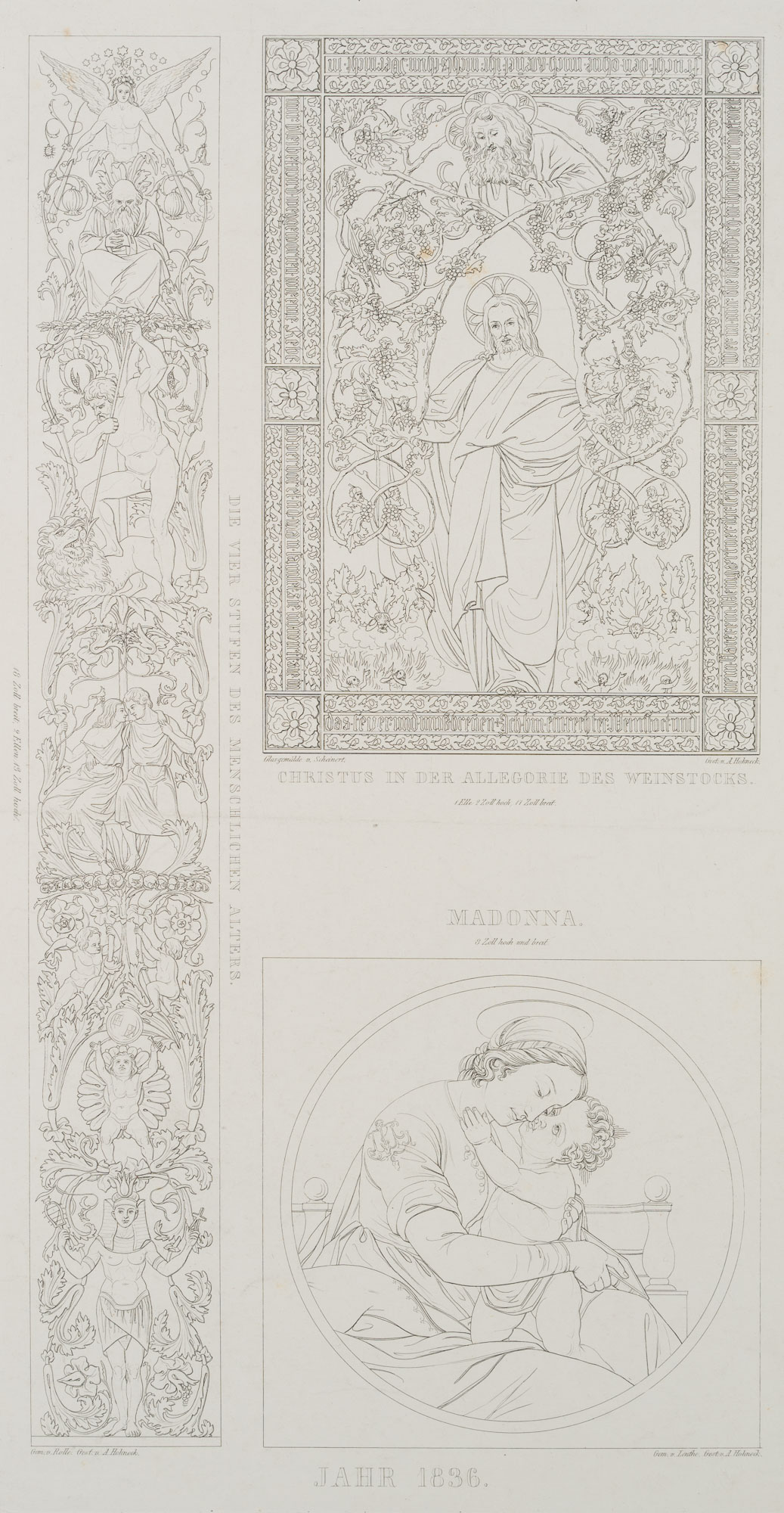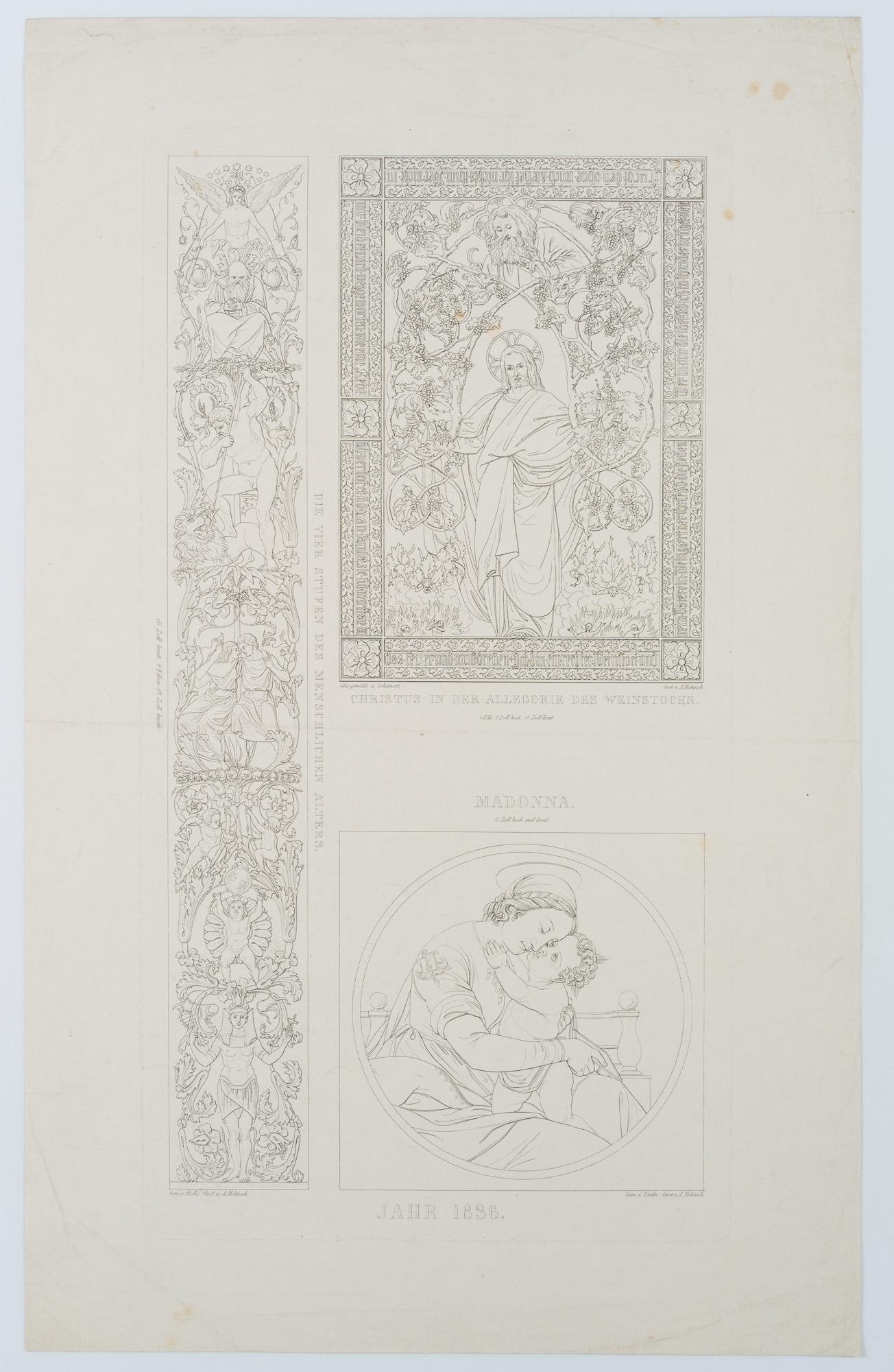 Adolf Hohneck (1812 Dresden – 1879 Oberlößnitz) nach Carl Samuel Scheinert (1791 Dresden – 1868 Meißen), Biblische Bildnisse von Madonna mit dem Jesusknaben, Christus in der Allegorie des Weinstocks und einem Bilderstreifen mit Lebenstreppe ‘Vier Stufen des menschlichen Alters’, 1836, Umrissradierung, 1836, Radierung