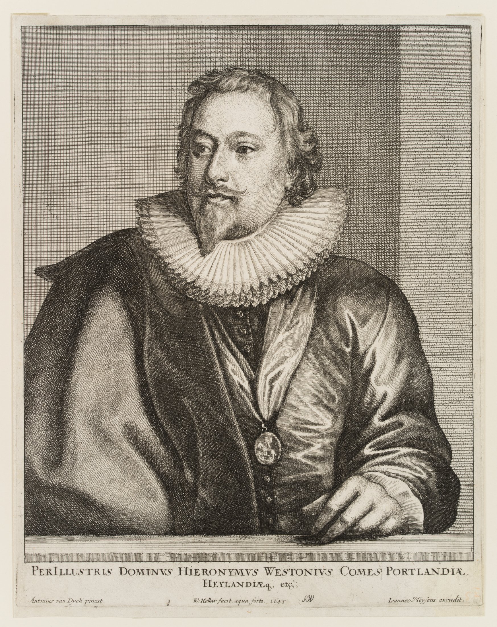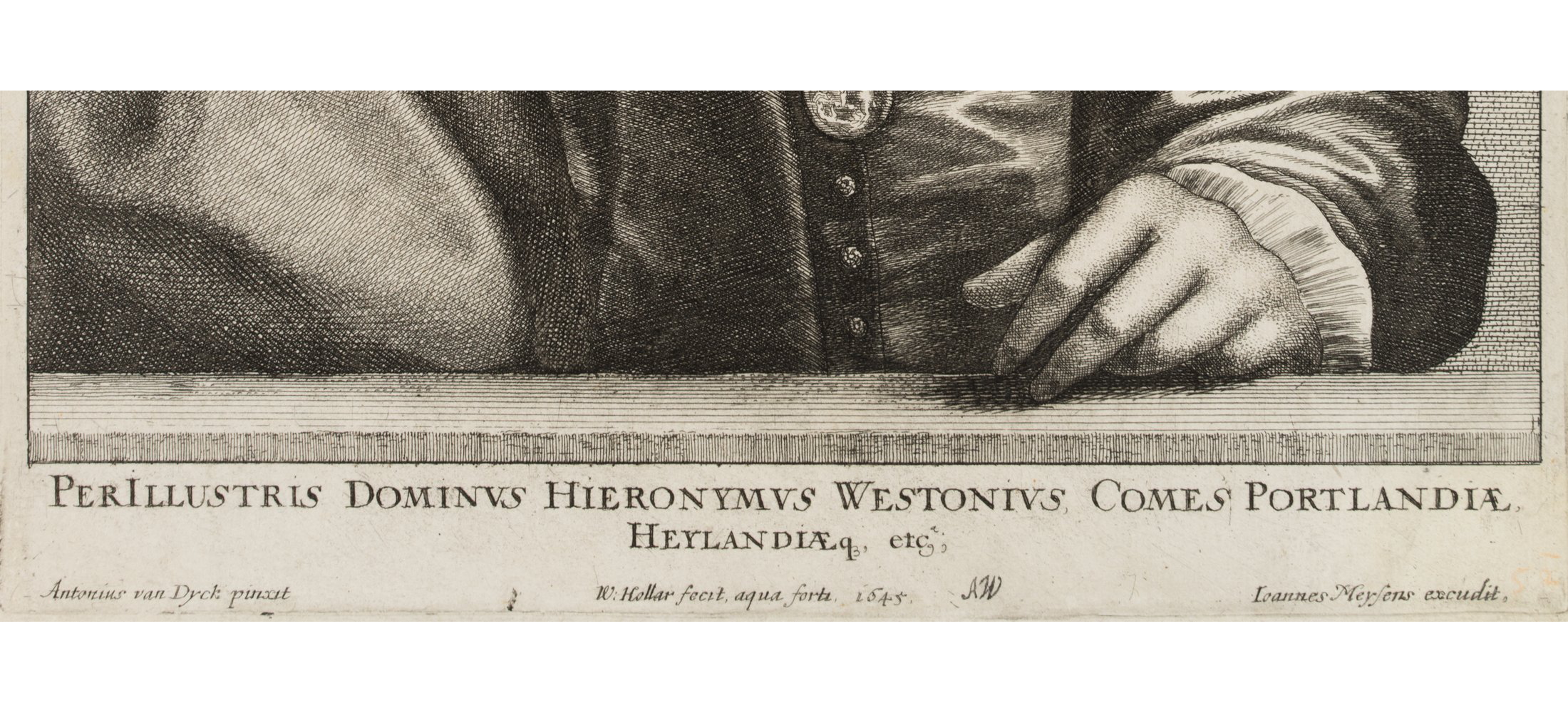 - Inscription: Inscribed below the image in the printing plate “PER ILLUSTRIS DOMINVS HIERONYMVS WESTONIVS COMES PORTLANDIÆ, HEYLANDIÆque etc.”, signed and dated below “Antonius van Dyck pinxit”, “W: Hollar fecit, aqua forti, 1645” and “Ioannes Meysens excudit.”, inscribed below centre in black ink “AW”.