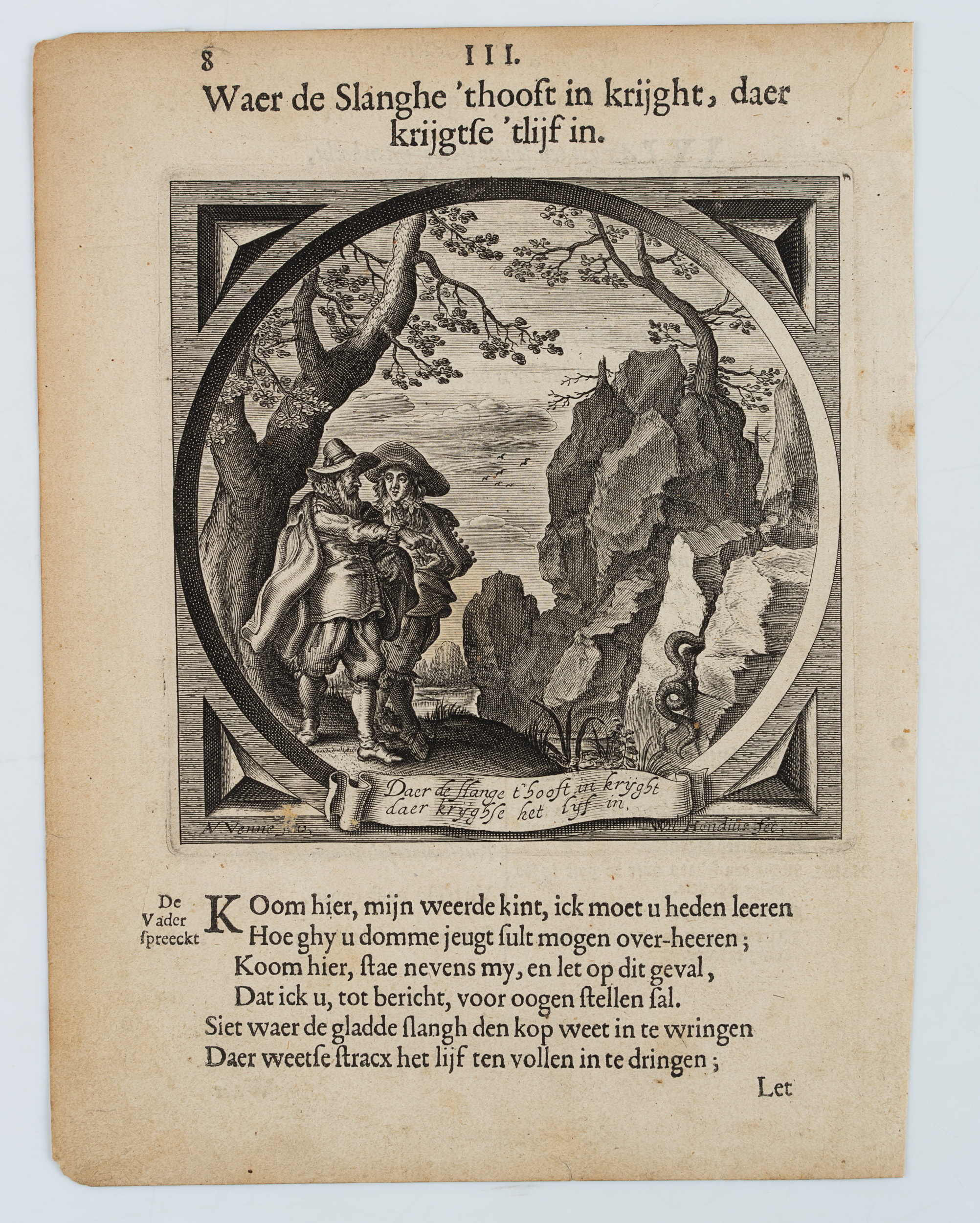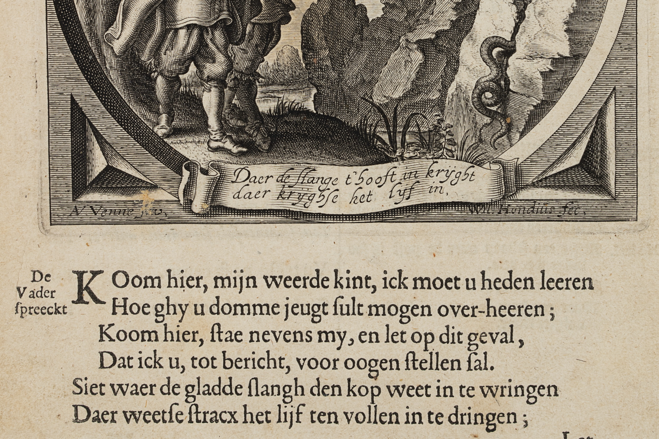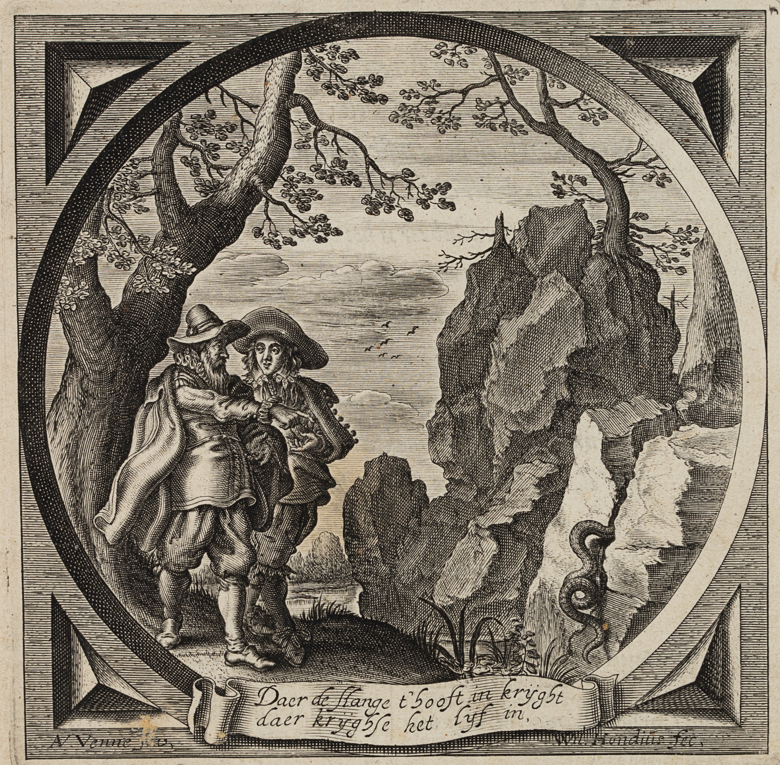 - Bezeichnung: Unten im Druck signiert: “AV. Venne Inv. / Wil. Hondius fec.”. Unten mittig im Druck bezeichnet: “Daer de slange t’ hooft in krijght / daer krijghse het lijf in.”.