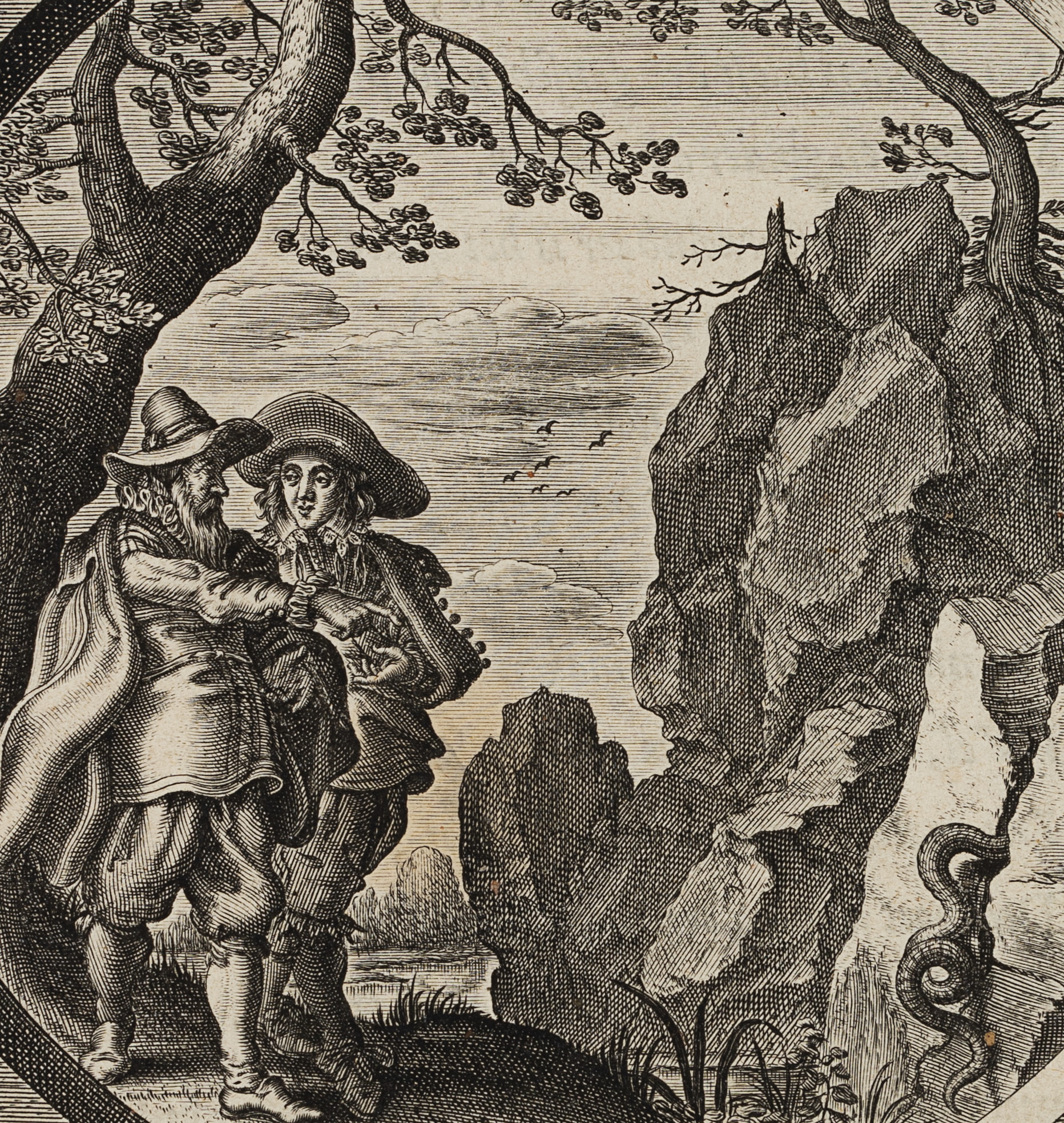 - Description: In the left half of the picture two men, presumably father and son, are standing in front of a tree. The father points to a snake at the right edge of the picture, which is crawling into a crevice. The foreground is adorned by a kind of faceted stone decoration that provides a circular view of the scene. At the lower edge of the picture are the signatures of the artist and etcher as well as a banner.