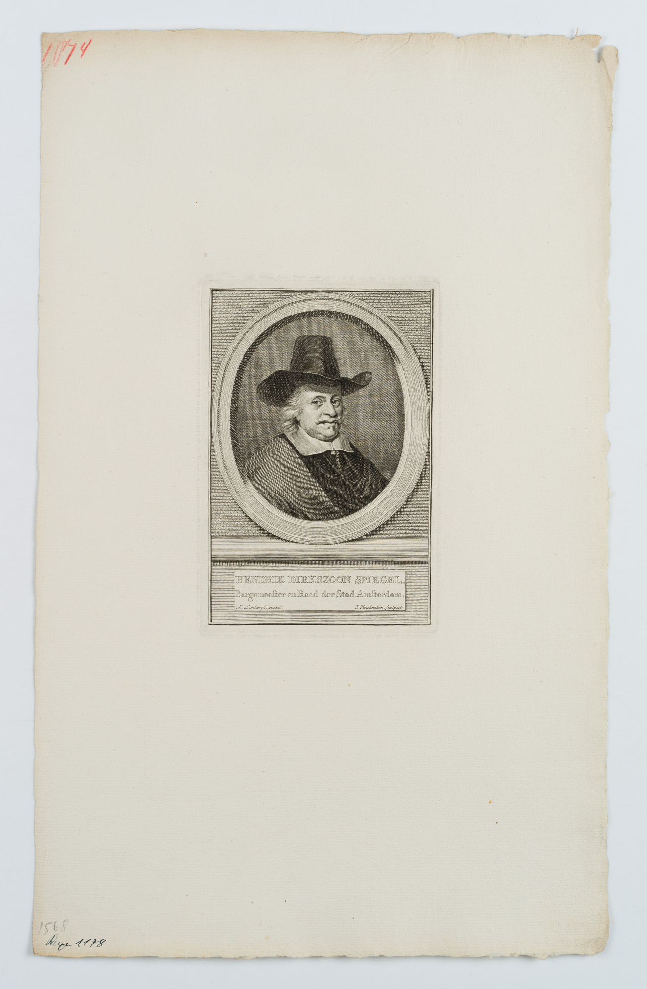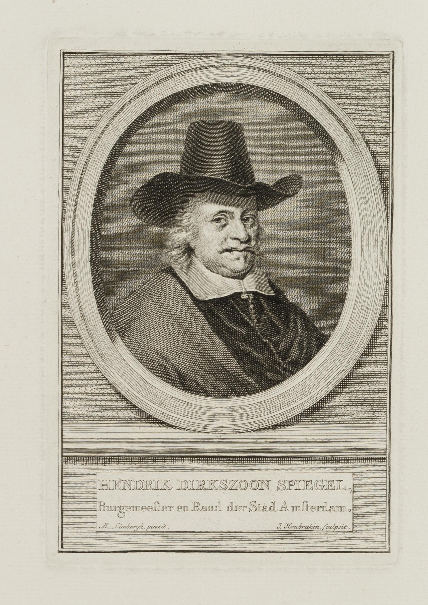 Jacobus Houbraken (1698 Dordrecht – 1780 Amsterdam) after Michiel D. van Limborch (17th century), Portrait of Hendrik Dirksen Spiegel, Mayor of Amsterdam, bust in three-quarter profile to the right, facing the viewer, wearing a black broad-brimmed hat and white collar., 18th century, Copper engraving