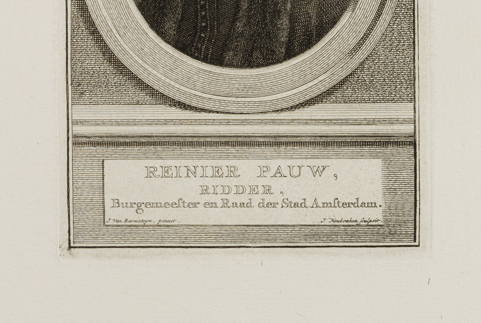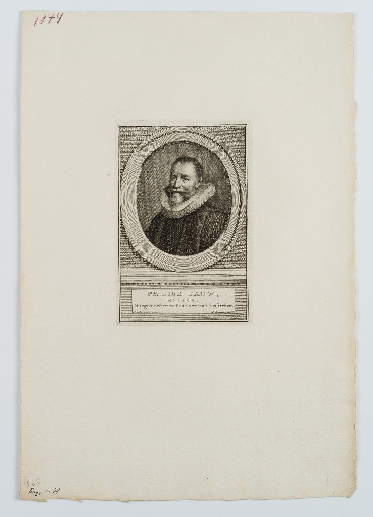 Jacobus Houbraken (1698 Dordrecht – 1780 Amsterdam) after Jan Anthoniszoon van Ravesteyn (around 1570 The Hague – 1657 ibid.), Portrait of Reinier Pauw (1564 Amsterdam – 1636 ibid.), bust in oval in three-quarter profile to the left., 18th century, Copper engraving