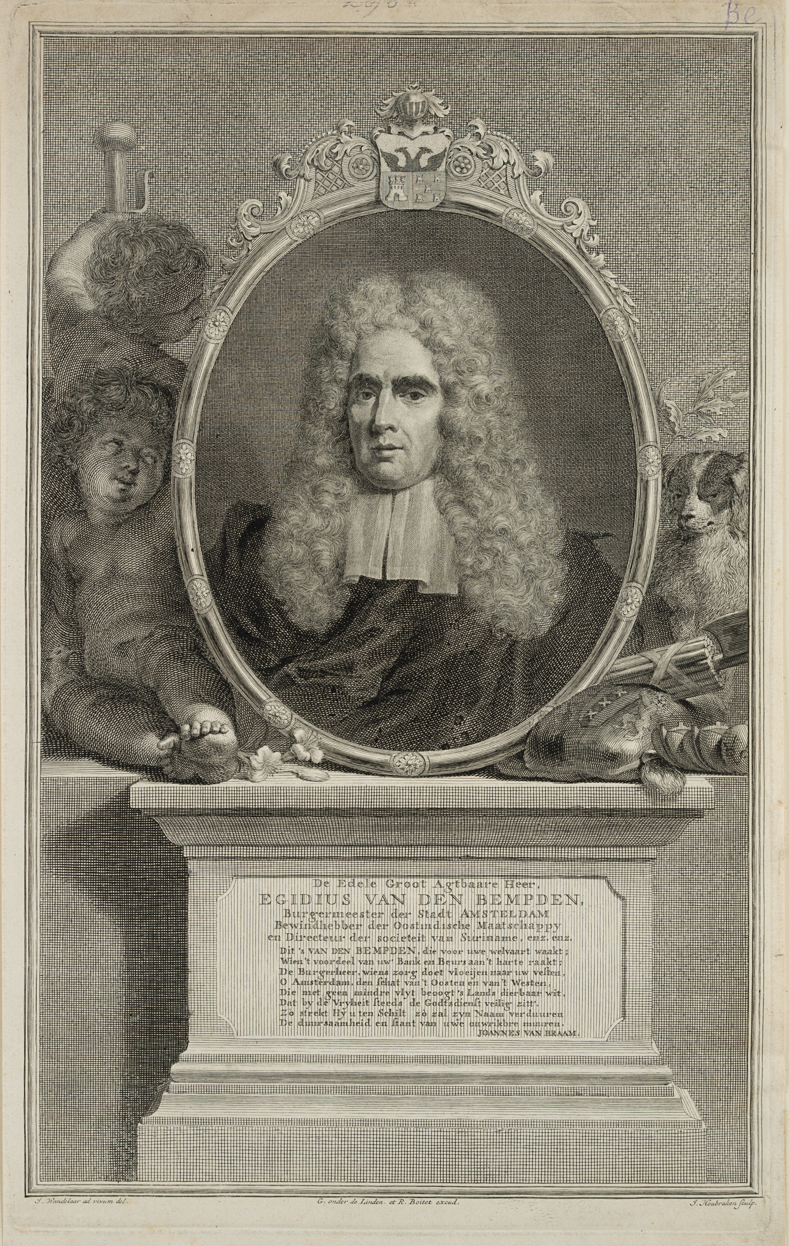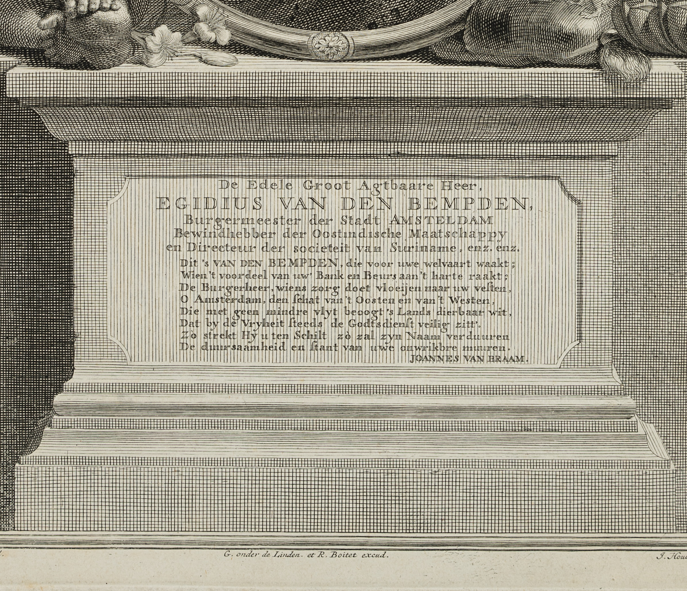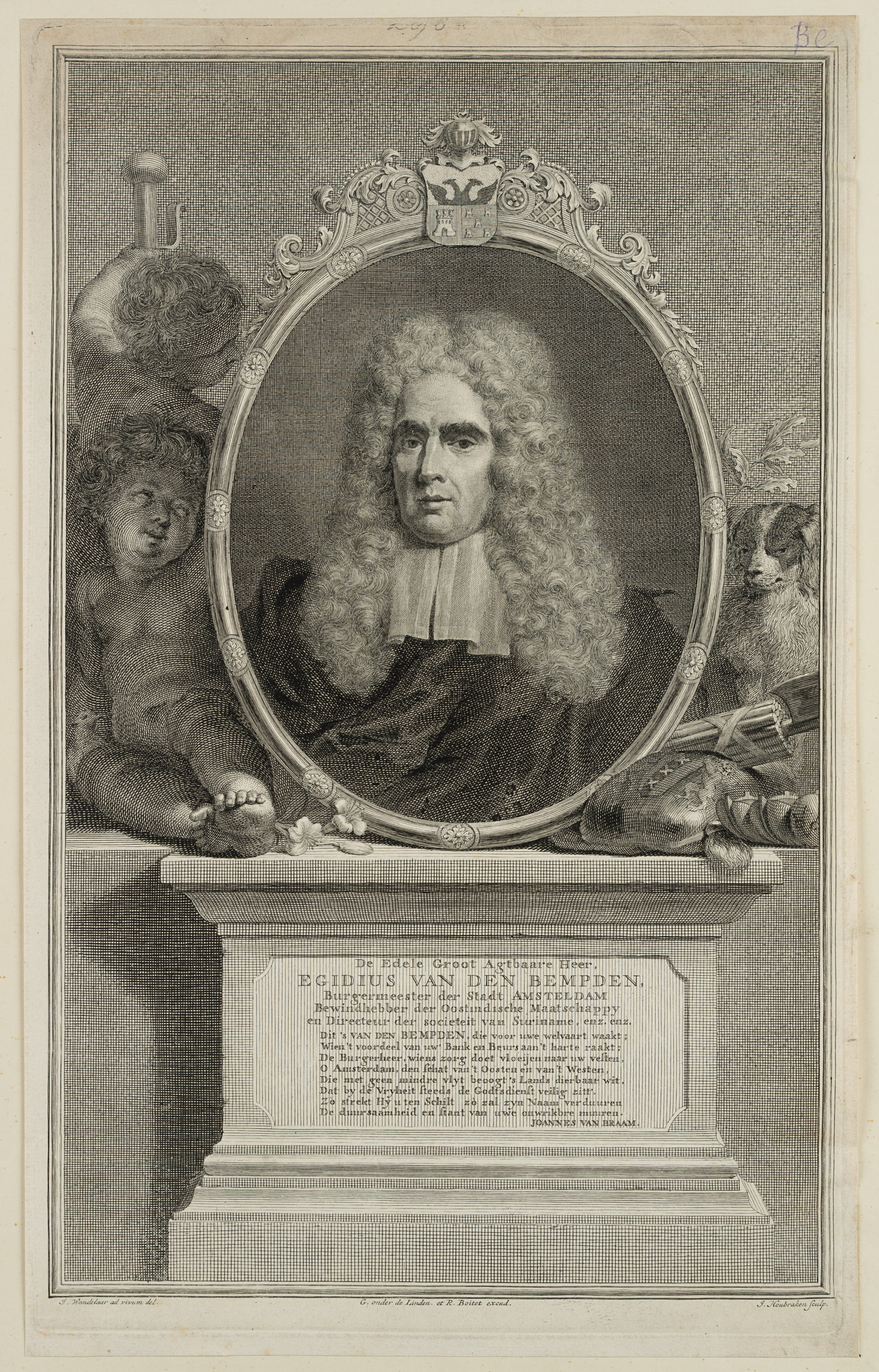 - Inscription: Lower right signed in the printing plate: “J. Houbraken sculp.”. At the lower part inscribed in the printing plate: “De Edele Groot Agdbare Heer, EGIDIUS VAN DE BEMPDEN, / […]”, “J. Wandelaar ad vivum del.”, “G. onder de Linden et R. Boitet excud.”.