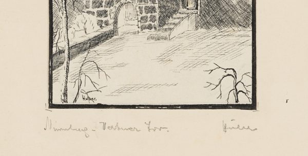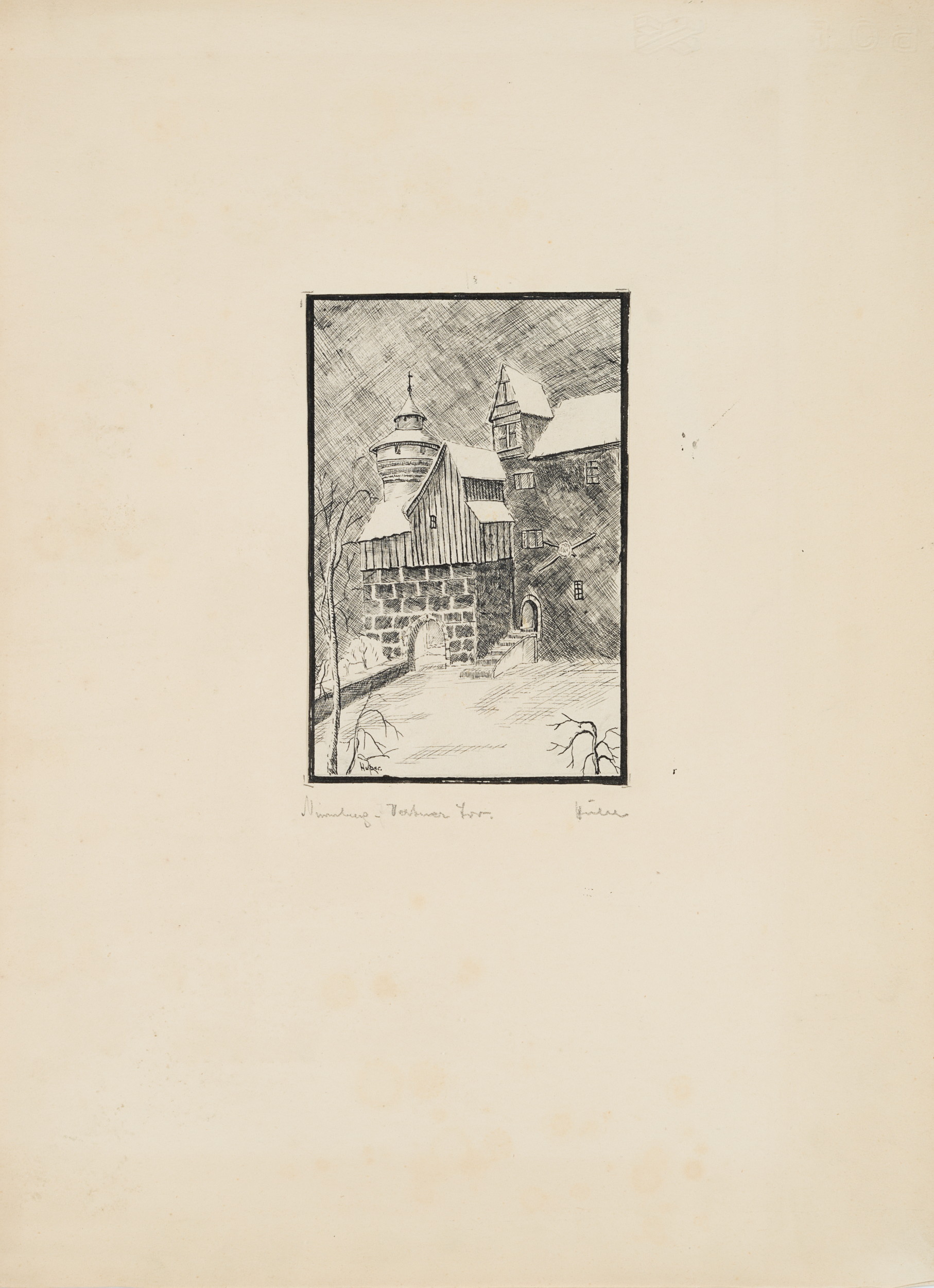 - Bezeichnung: Unten links signiert: “Huber”. Unten links auf der Unterlage bezeichnet: “Nürnberg – Vestner Tor”.
