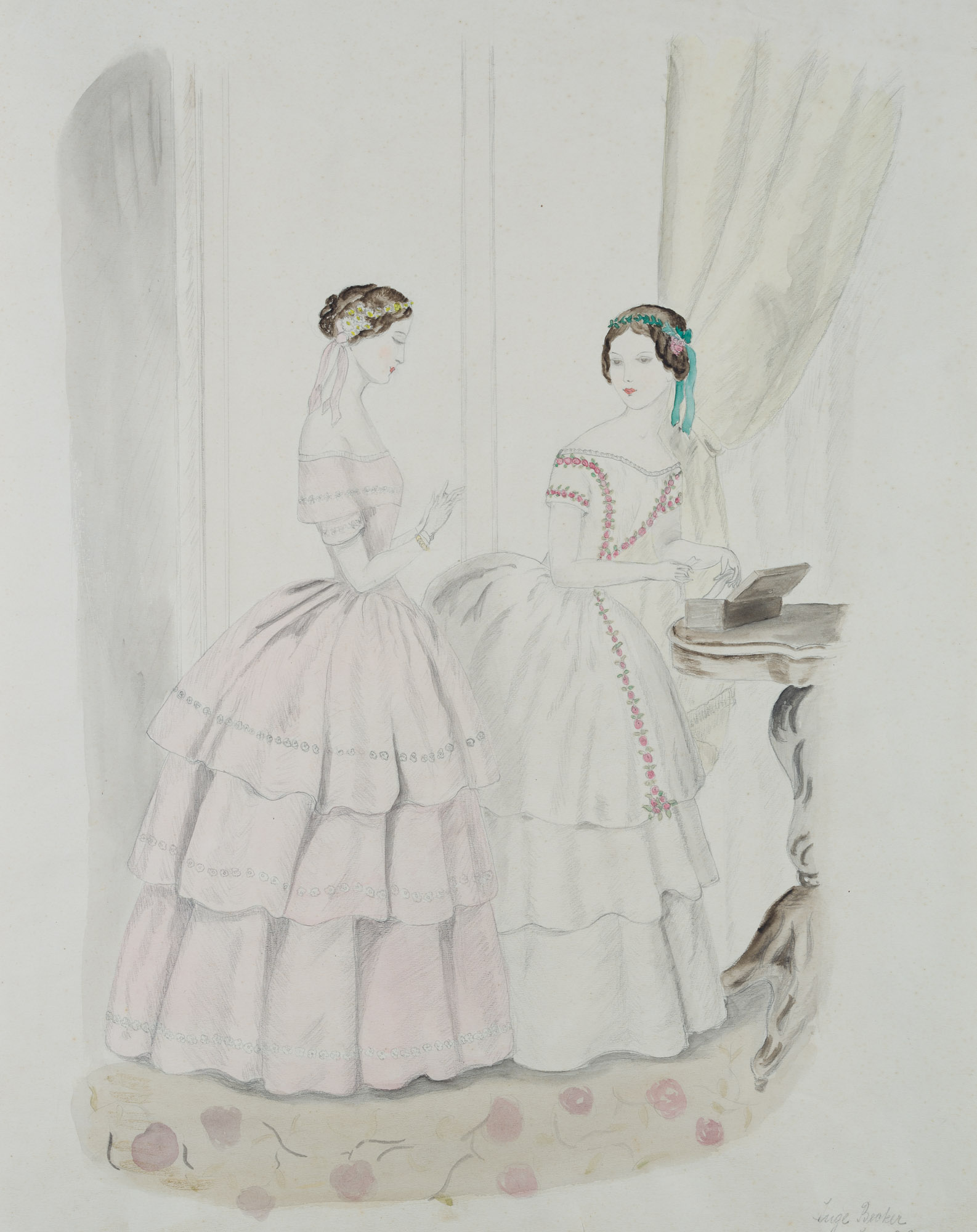 - Description: Two ladies in precious pastel-coloured dresses with flared flouncy skirts and flowers in their hair. Signed and dated in pencil lower right “Inge Becker Juli 1933”.