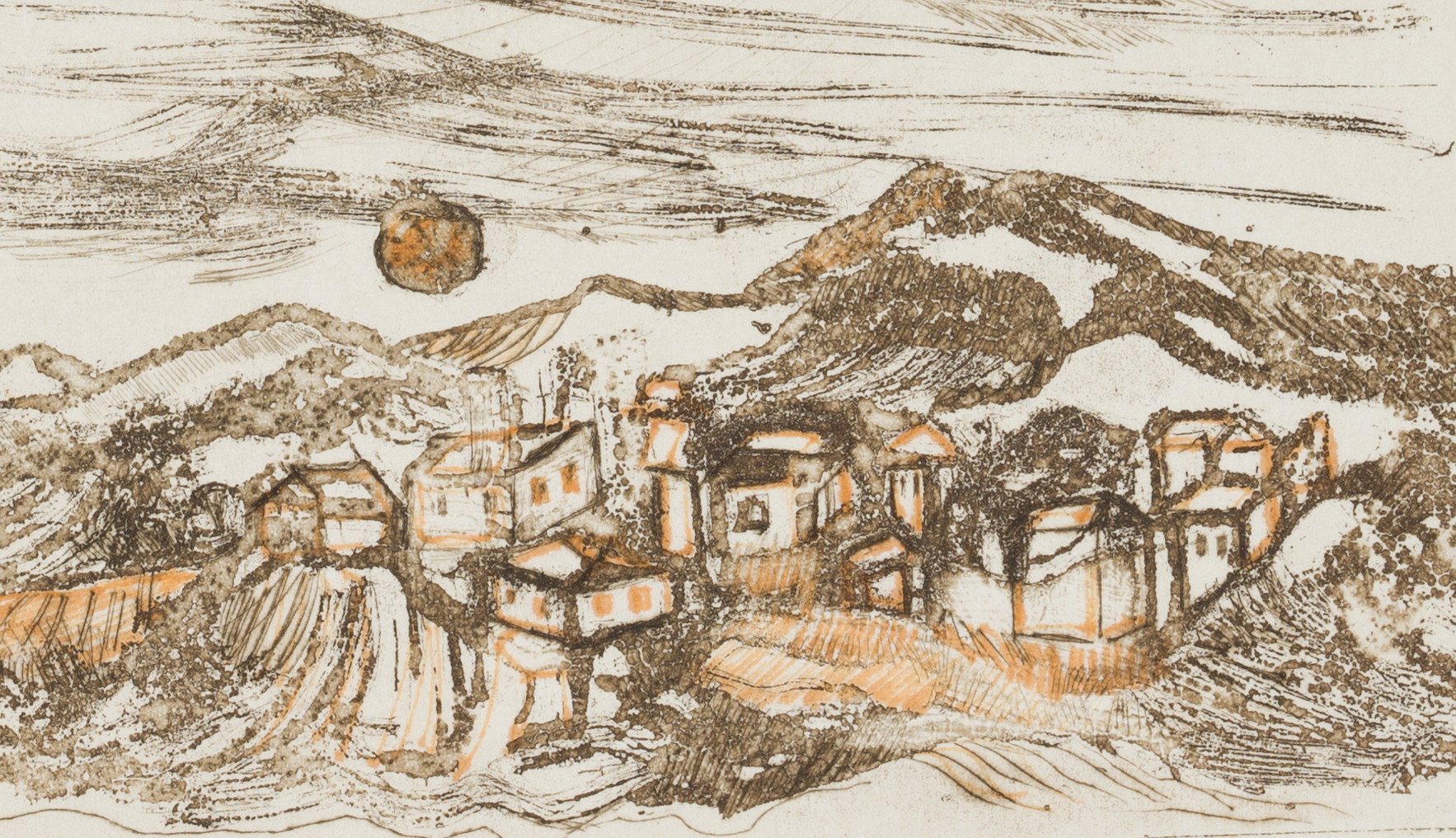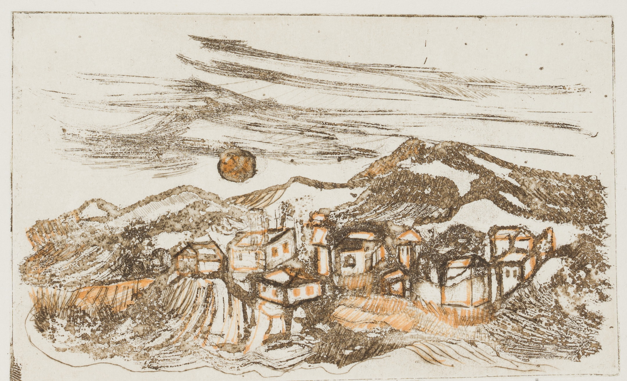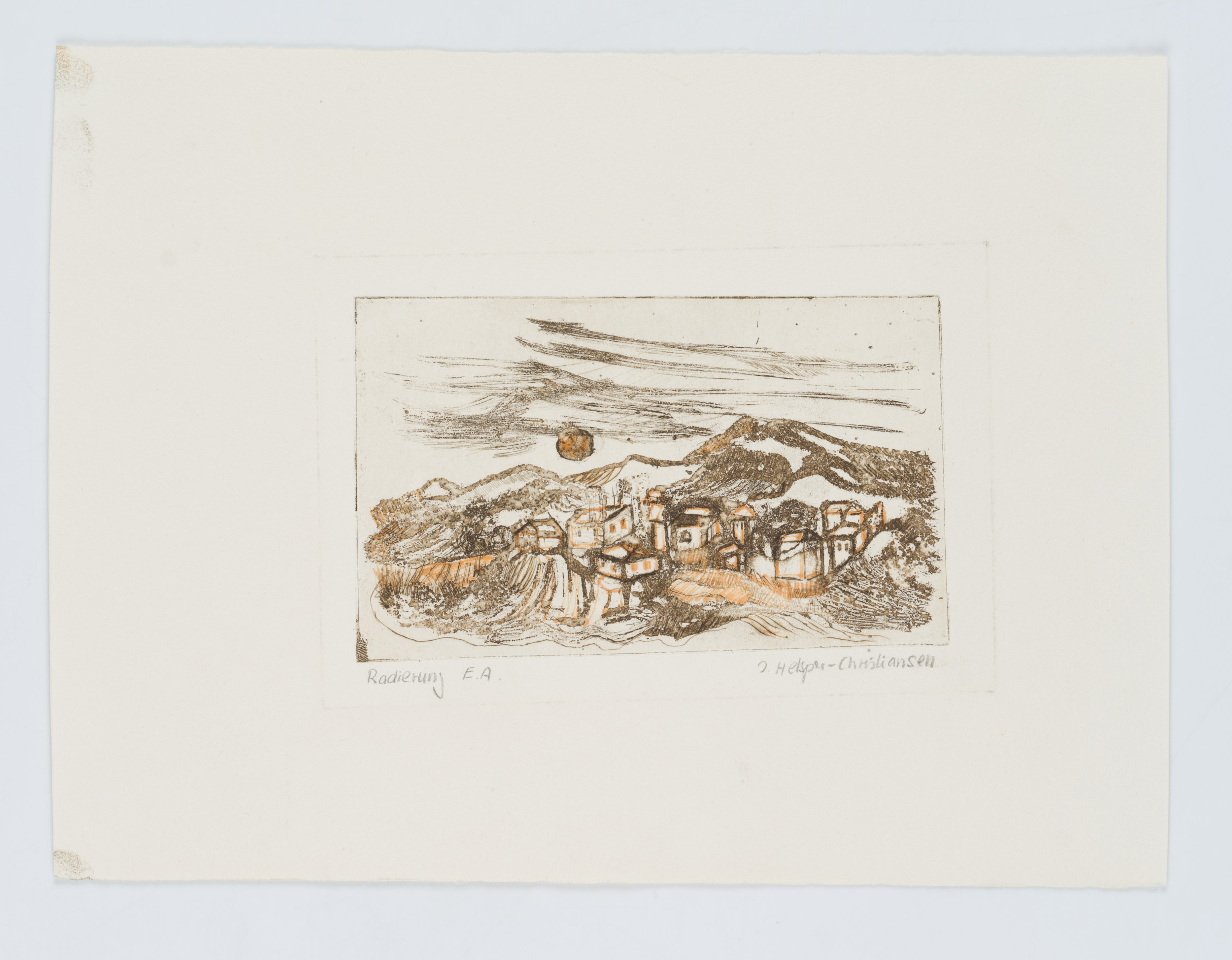 Inge Helsper-Christiansen (born 1942 ), Cityscape in front of mountain range with setting sun, , Etching