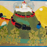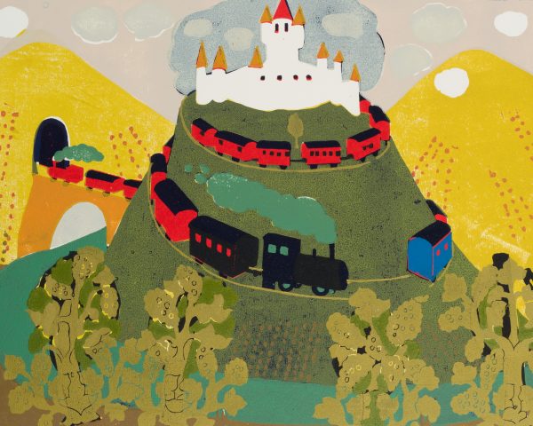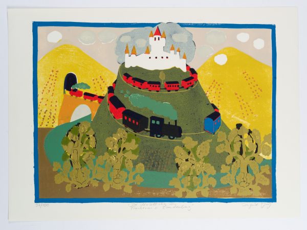 - Keywords: Artist graphics, colours, children, children’s book, children’s book illustration, Berlin hand press, children’s book illustration, fantasy, colour linocut, Moselbahn, Bimmelbahn, steam locomotive, castle, 20th century, Naive, Landscape, Germany,