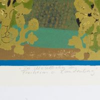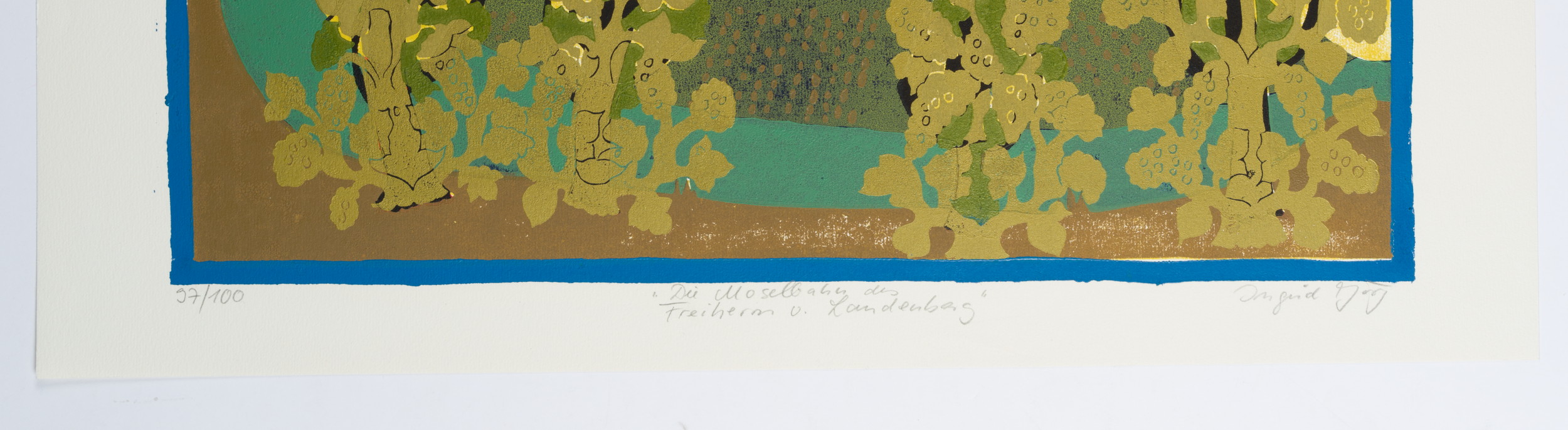 - Inscription: Lower right signed: “Ingrid Jörg”. Lower middle inscribed by the artist’s hand: “Die Moselbahn des Freiherrn von Landenberg”.