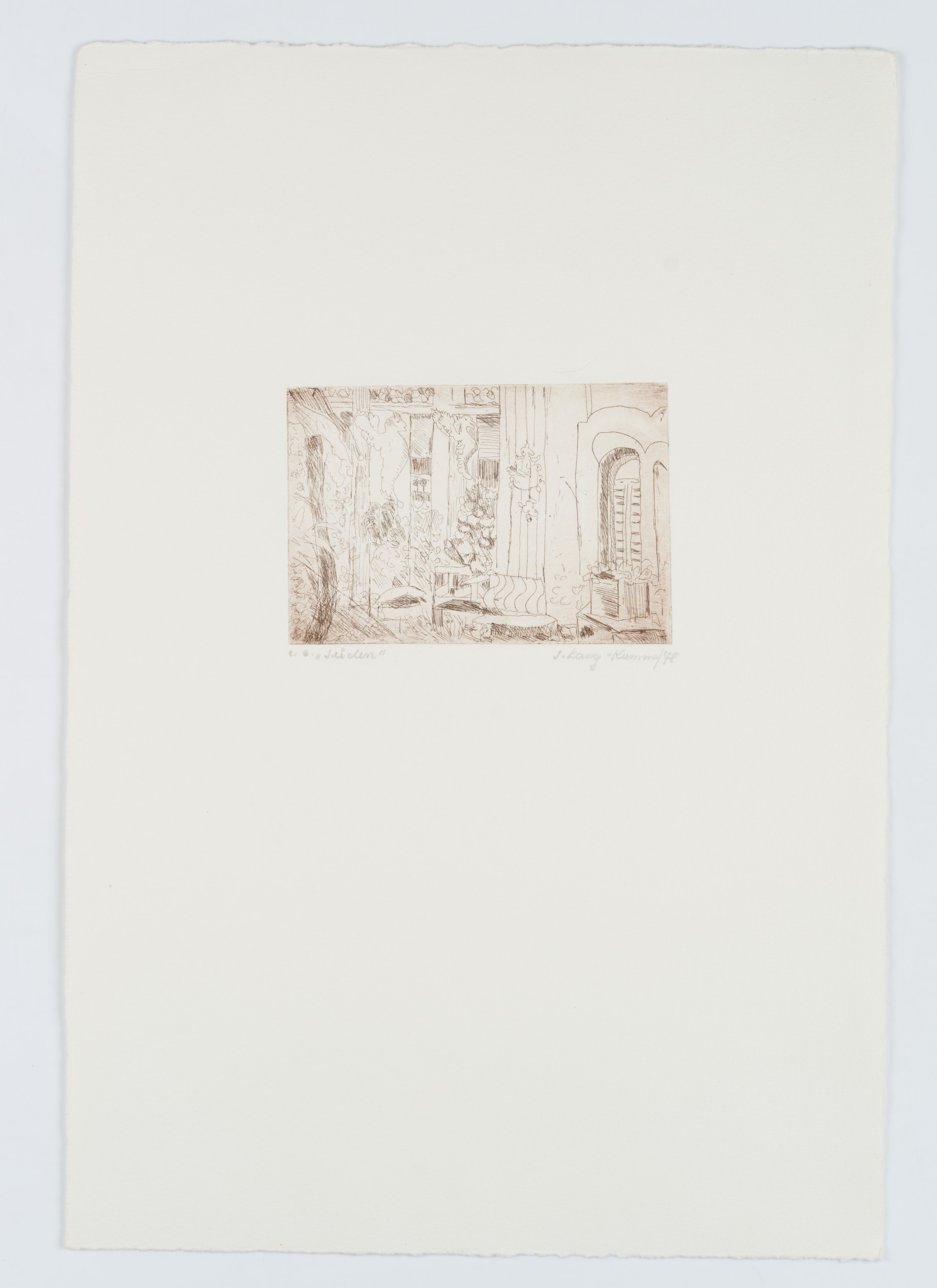 Irmi Lang-Kummer (*1935 Berlin), “Süden” Blick auf eine mediterrane Terrasse, 1978, Kaltnadelradierung