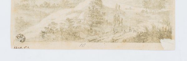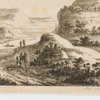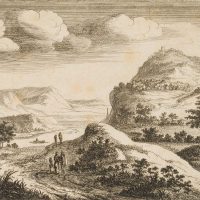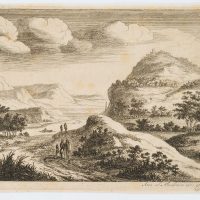 - Beschreibung: Mit Spaziergängern als Staffagefiguren. Rechts auf dem obersten Hügel ist ein Burgturm zu erkennen