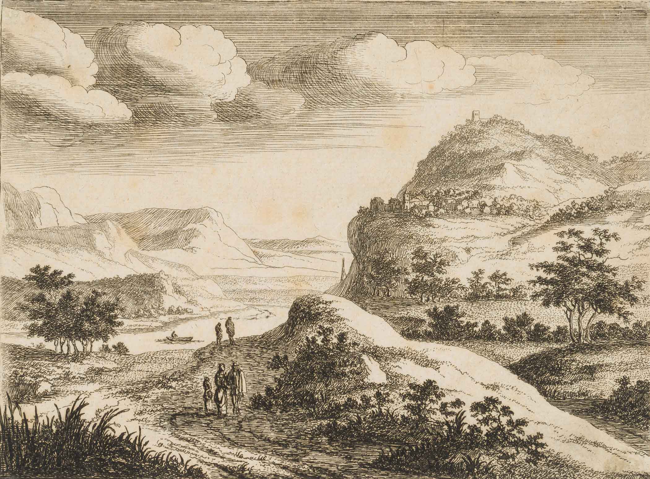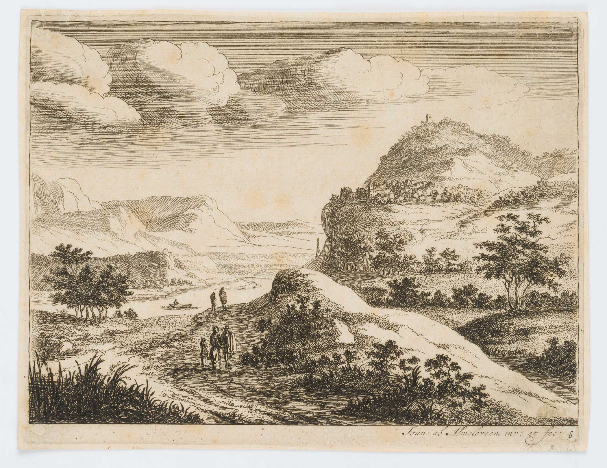 Jan van Almeloveen (born around 1652 Mijdrecht), River Landscape with Village on the Slope, , Etching