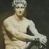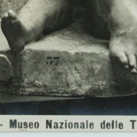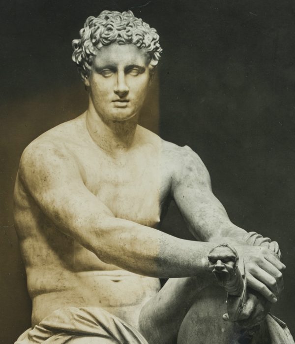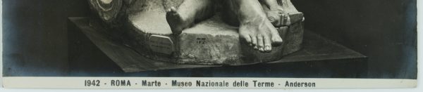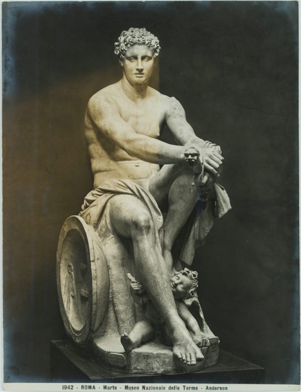 - Description: Signed on the glass plate; no. 1942. The work is from the series of baroque and antique artworks from Rome and Florence and shows a seated statue of Mars, the god of war, as a youth.