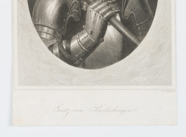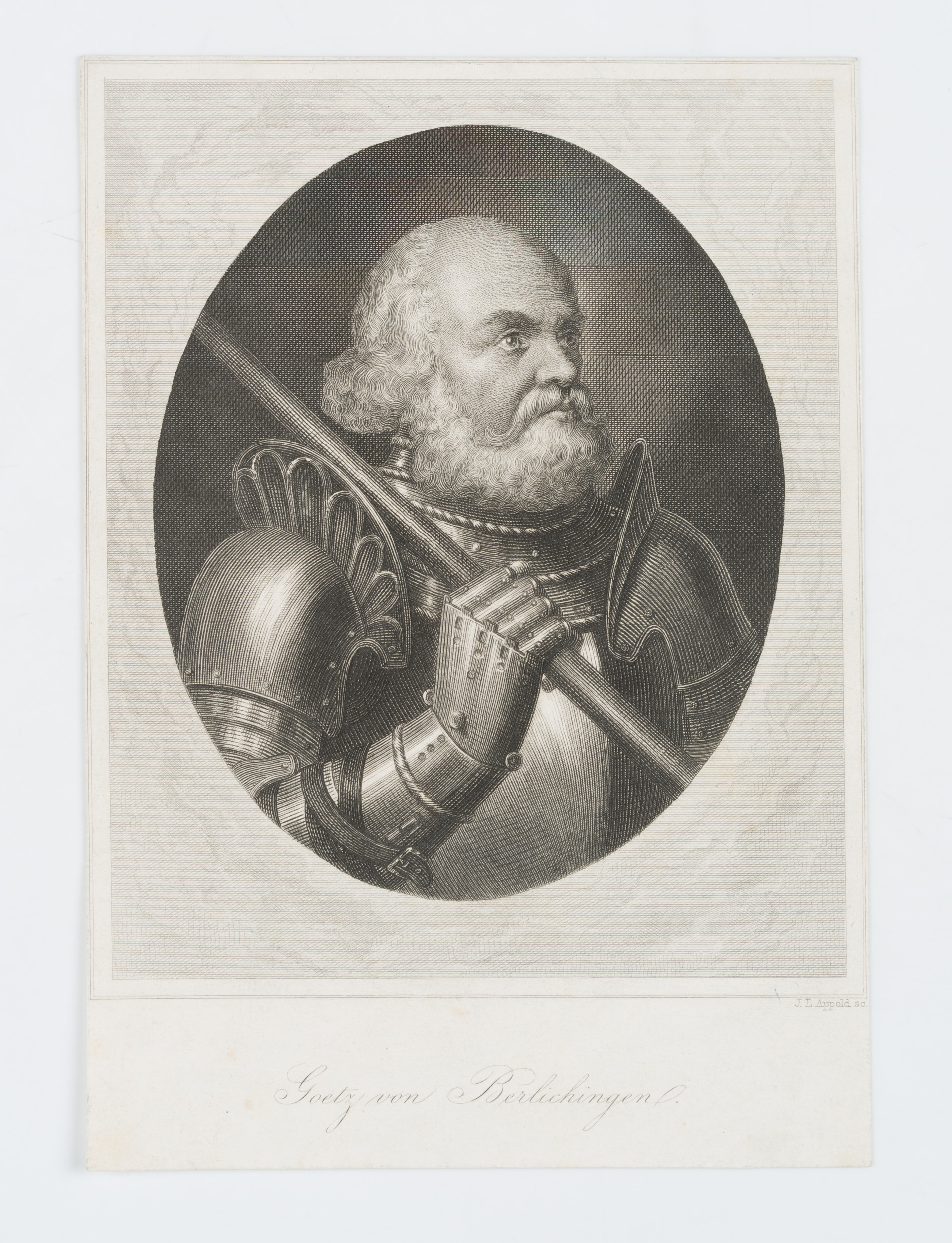 - Inscription: Lower right signed in the printing plate: “J. L. Appold sc.”. Lower middle inscribed in the printing plate: “Goetz von Berlichingen.”.