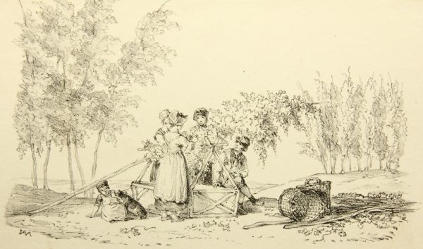 - Description: Genre depiction of a group of children with large baskets harvesting hops. The monogram of the artist is in the lower left of the stone.